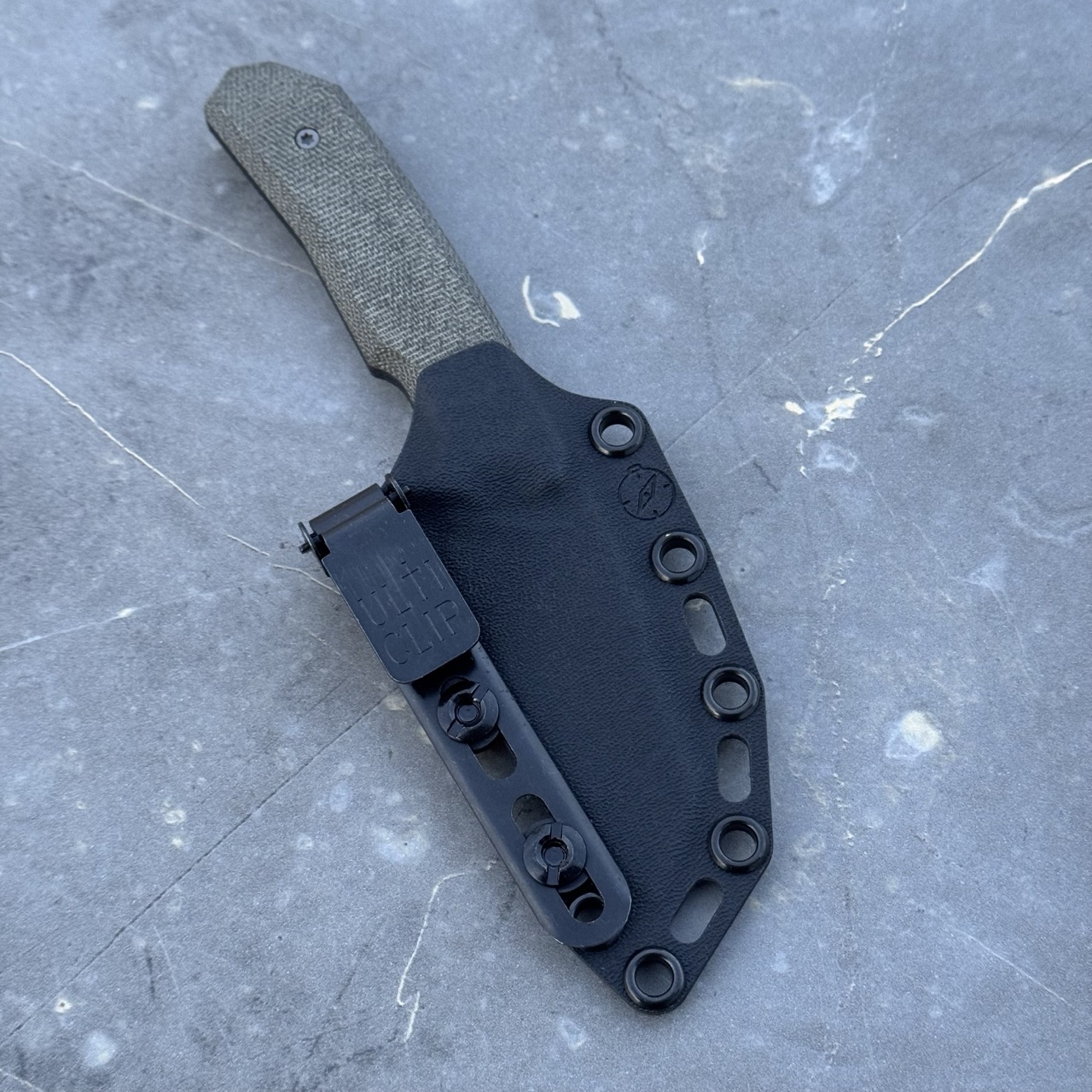 **OPCJE PRZENOSZENIA**. Kaburę do pasa mocujemy za pomocą załączonego stalowego klipsa marki UltiClip w rozmiarze Slim 3.3. Po zdemontowaniu klipsa całośc można przenosić swobodnie w kieszeni, co przy kompaktowych gabarytach noża może być dla niektórych bardzo wygodne. Kabura zaopatrzona została w otwory przelotowe, które można wykorzystać opcjonalnie do przytwierdzenia zestawu do plecaka czy elementu uprzęży taktycznej linką, sznurkiem czy paracordem.