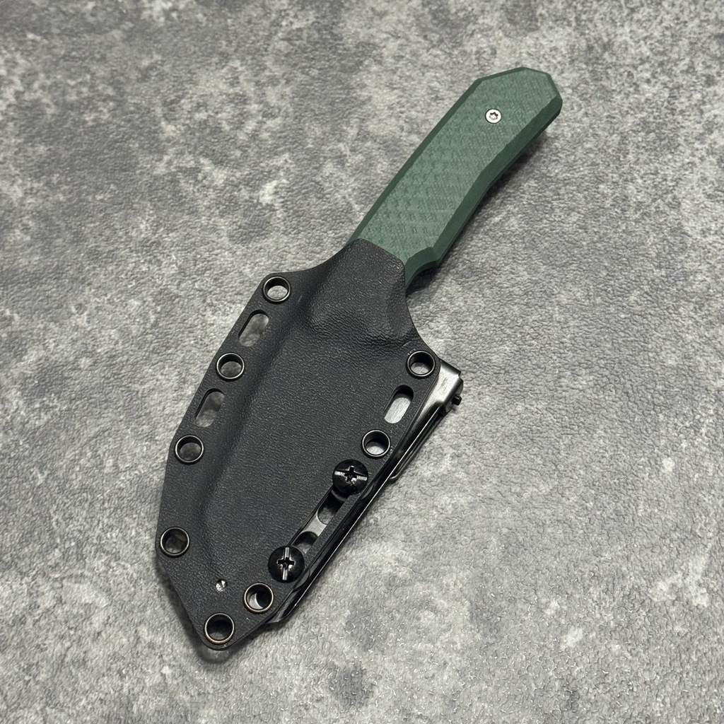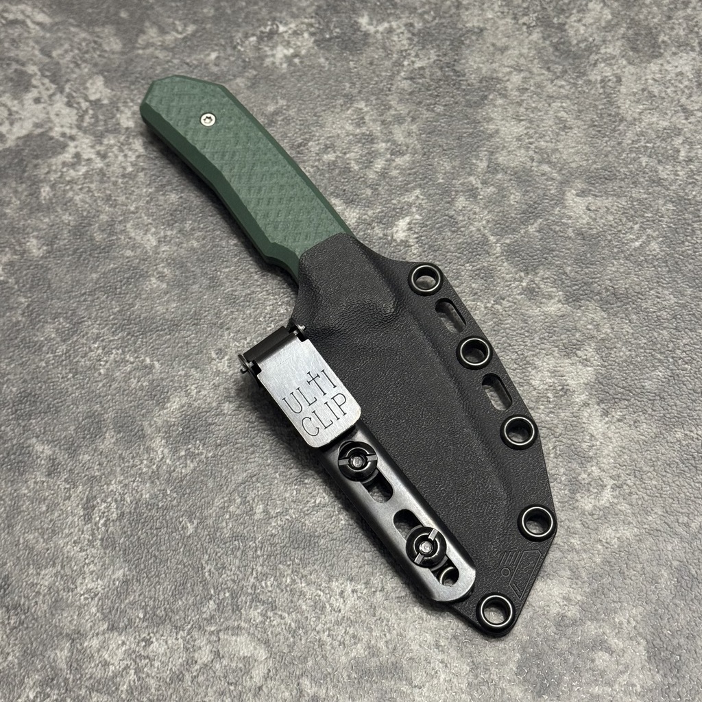 **Rękojeść obudowująca trzpień wykonana została z zielonego laminatu G10. W zestawie znajduje się kabura z czarnego tworzywa Kydex z klipsem Ulticlip Slim 3.3 oraz piktogramem prototypów.