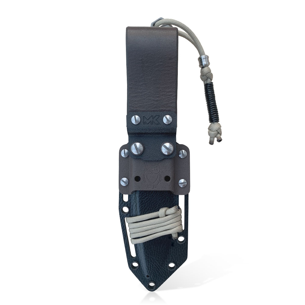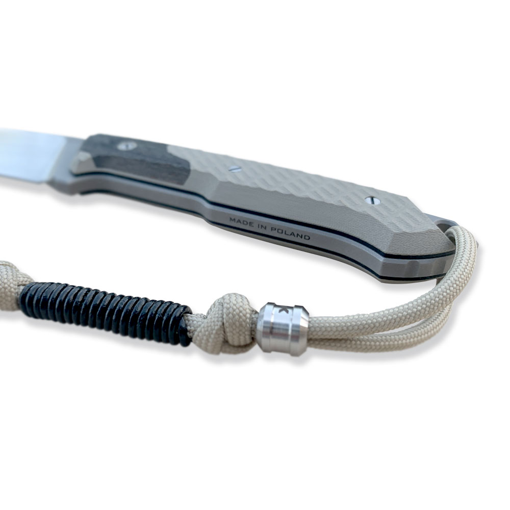 Na zakończeniu rękojeści noża znajdziemy dyskretny otwór na zamocowanie dodatkowej linki, która może służyć jako zabezpieczenie przed upuszczeniem noża podczas pracy, lub dodatkowy chwytak ułatwiający wyjmowanie noża z kabury. Oryginalnie załączono w nim odcinek paracordu o dobranym do designu odcieniu. Na końcu załączonego odcinka paracordu znajdziemy poprawiający chwytność skórzany oplot oraz satynowany koralik MK ze stali nierdzewnej.
