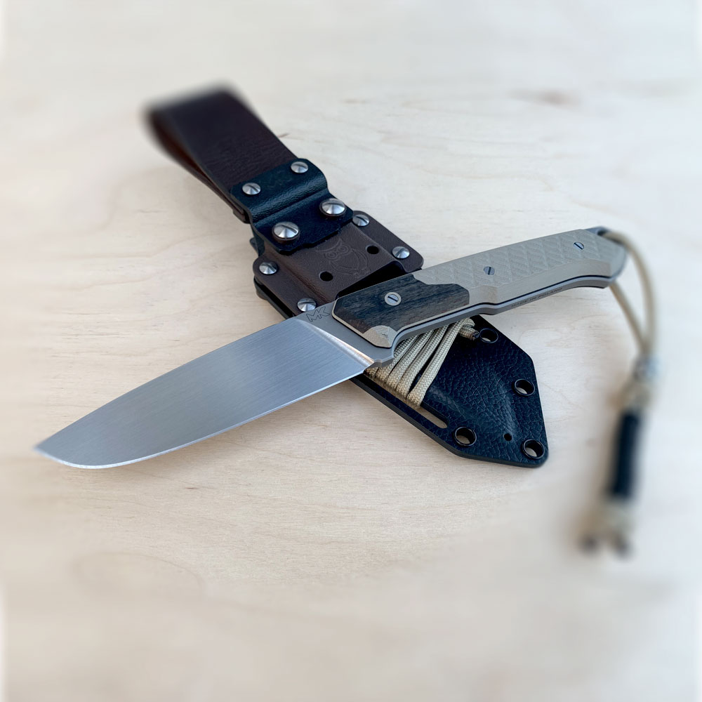 Okładziny rękojeści o ergonomicznym, zowalizowanym kształcie wykonane zostały z bardzo wytrzymałego kompozytu G10. Okładki mają kolor Desert Tan, czarne przekładki i uzupełnienia z tego samego materiału. Posiadają one również wstawki z drewna stabilizowanego, które nadają całości niezwykłego charakteru. Kompozyt G10 jest odporny na wilgoć, zmiany temperatury, większość rozpuszczalników i kwasów, posiada wysoką odporność na uszkodzenia mechaniczne. W prezentowanym nożu materiał okładek posiada chropowaty wzór zapobiegający ślizganiu się rękojeści w dłoni. Okładki rękojeści zostały skręcone stalowymi, satynowymi śrubami, spójnymi z designem ostrza.