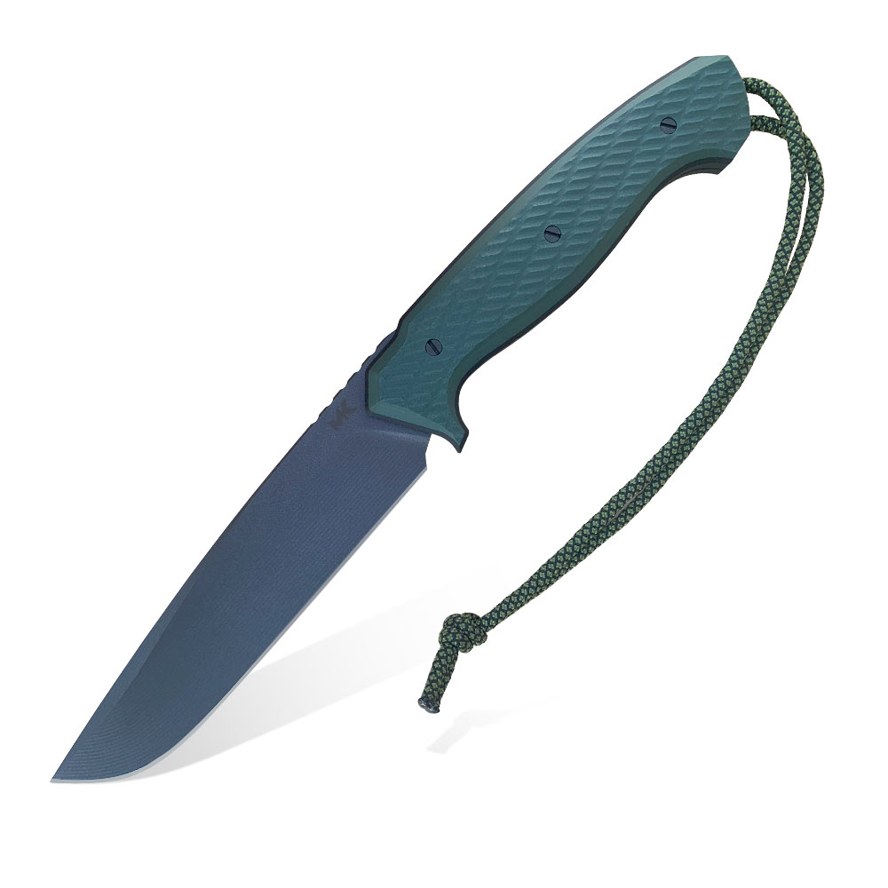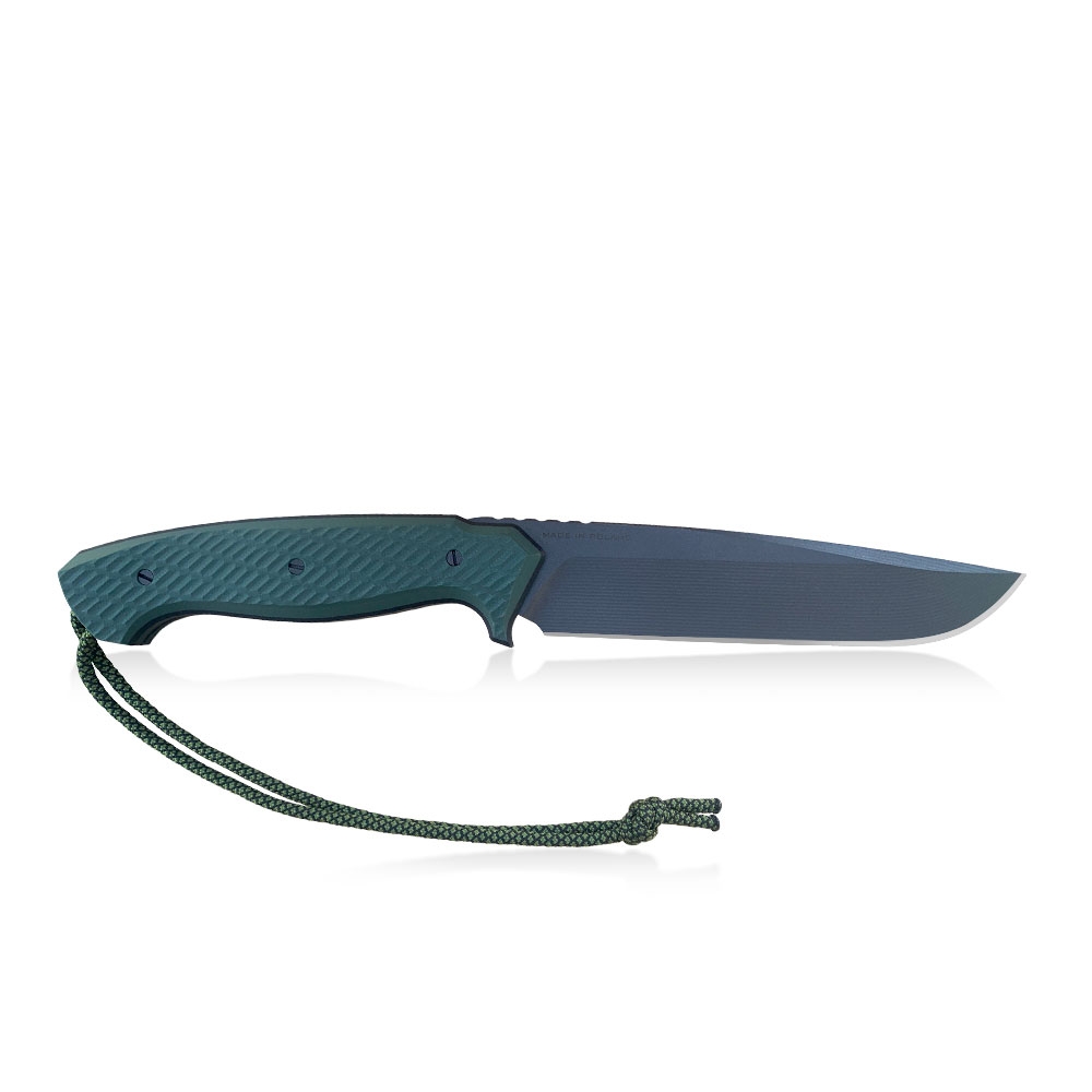 Okładziny rękojeści o ergonomicznym, zowalizowanym kształcie wykonane zostały z bardzo wytrzymałego kompozytu G10 (połączenie kolorów zielonego i czarnego). G10 jest odporny na wilgoć, zmiany temperatury, większość rozpuszczalników i kwasów, posiada wysoką odporność na uszkodzenia mechaniczne. W prezentowanym nożu materiał okładek posiada chropowaty wzór zapobiegający ślizganiu się rękojeści w dłoni. Okładki rękojeści zostały skręcone czarnymi stalowymi śrubami w powłoce PVD. Śruby dopełniają design noża, elegancko komponując się z czarnym ostrzem. Rękojeść została zaopatrzona w jelec z kompozytu G10 zapobiegający ześlizgnięciu się dłoni na ostrze. Jelec powstał z wyprofilowania okładzin rękojeści.