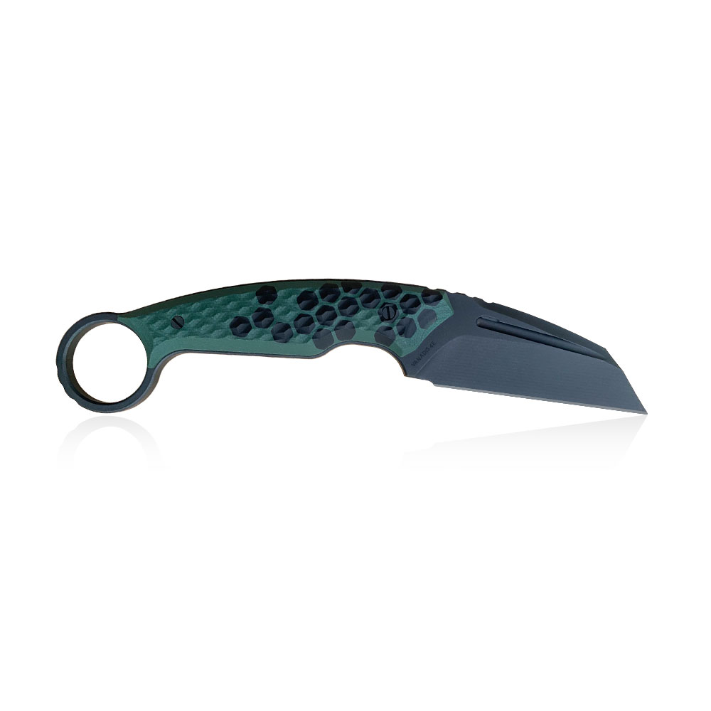 Nóż MK Knives & Tools Claw „Honeycomb & Dark Green” | Vanadis 4 Extra | PVD to projekt który wykonał Marcin Kampka. Jest to nóż z ostrzem typu karambit. Oryginalnie karambit powstał w odległych czasach na terenie Malezji oraz Filipin a jego kształt inspirowany był pazurami wielkich drapieżnych kotów. Charakterystyczne dla jego budowy były zakrzywione ostrze oraz odwrócona rękojeść z otworem na palec. Nóż Claw nawiązuje do tej stylistyki, jednakże jego ostrze posiada prostą krawędź tnącą, co zdecydowanie służy zwiększeniu jego funkcjonalności.
