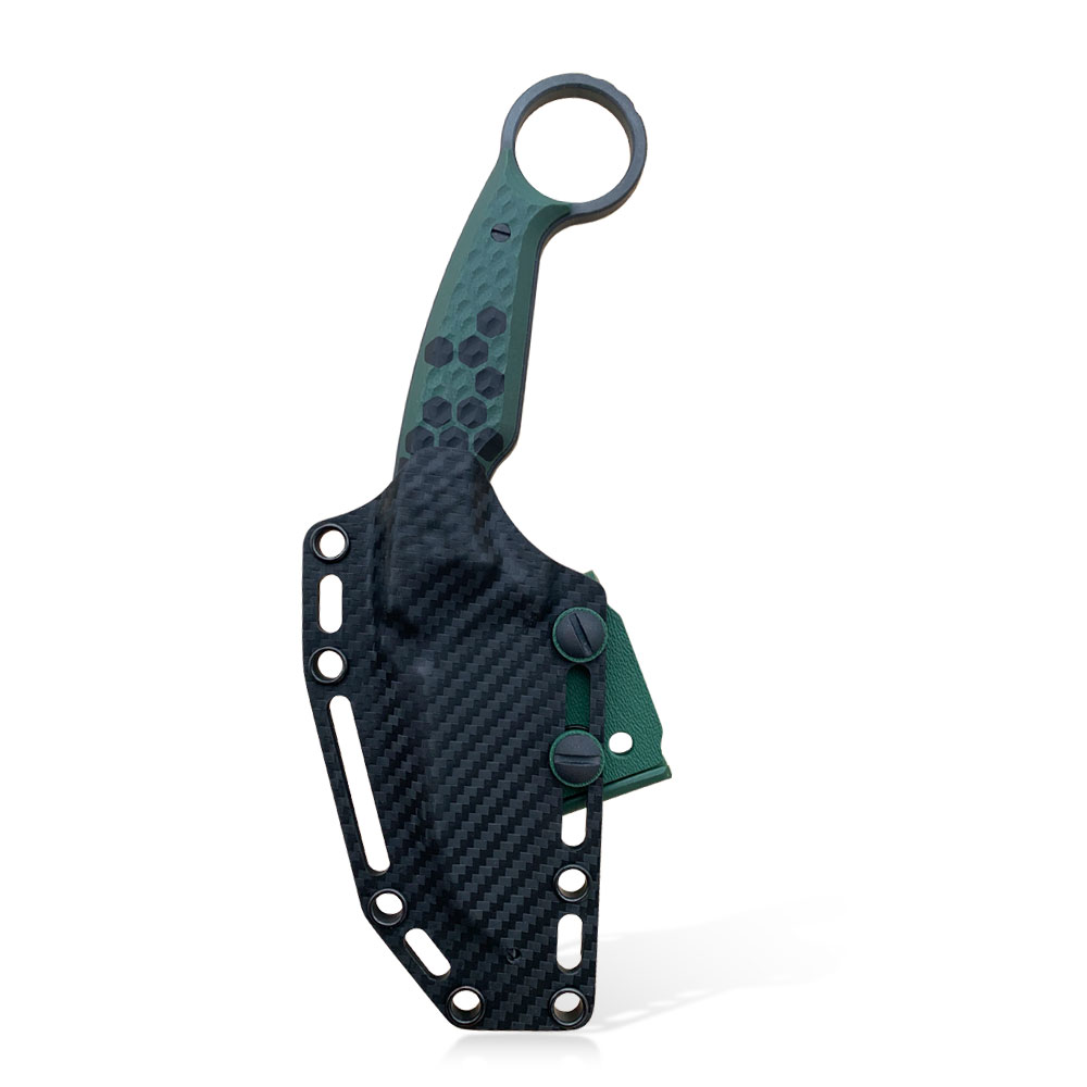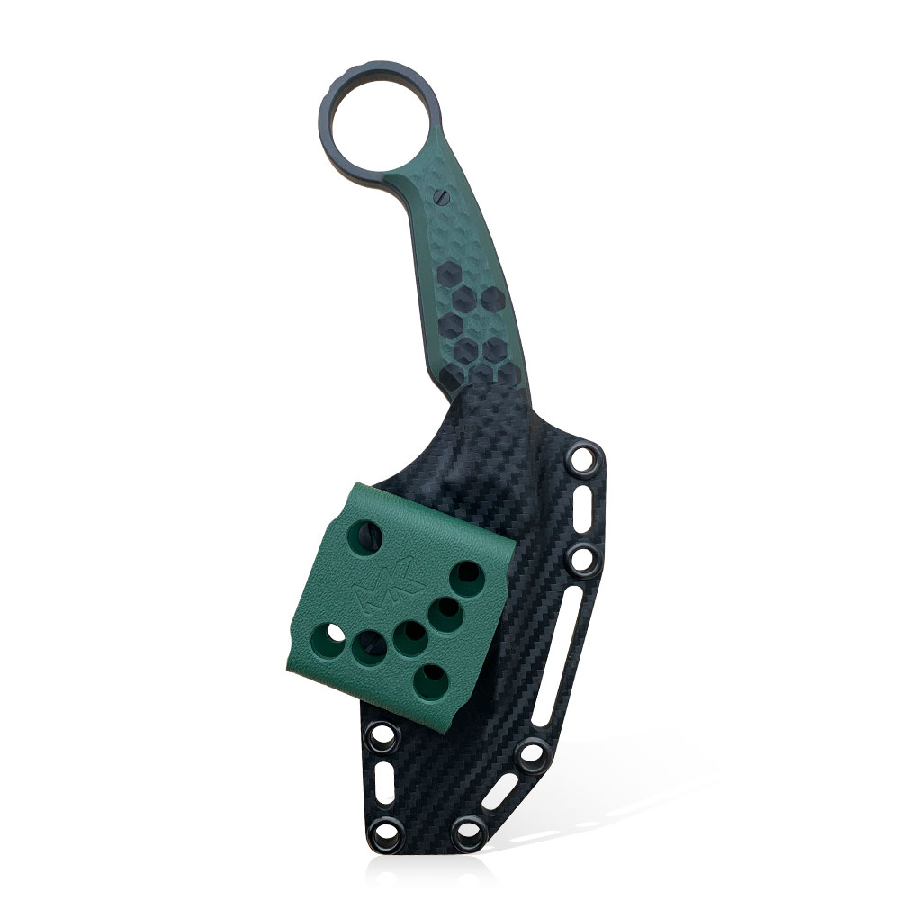 Zaprezentowany nóż MK Knives & Tools Claw „Honeycomb & Dark Green” | Vanadis 4 Extra | PVD posiada ostrze ze stali Vanadis 4 Extra, z bardzo ciekawym szlifem wklęsłym (charakterystyczne rowki na ostrzu) i zbroczem, rękojeść z wytrzymałego kompozytu G10 (kolor ciemnozielony oraz czarne wypełnienia epoksydowe o wzorze plastra miodu), oraz czarną kaburę z holtstexu o wzorze włókna węglowego (carbon). Kydex posiada możliwość zamontowania w pionie lub w poziomie lub pod wybranym kątem dzięki specjalnie do tego dostosowanej zielonej klamrze z kydexu.