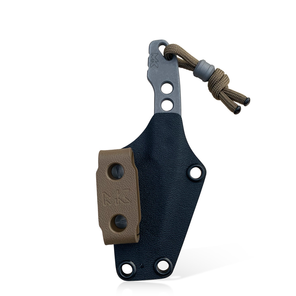 Zaprezentowany nóż MK Knives & Tools Spike Neck Elmax Coyote posiada ostrze z najwyższej jakości stali Elmax, wyprowadzone innowacyjnym szlifem wklęsłym (charakterystyczne rowki na ostrzu), kaburę z tworzywa kydex w kolorze czarnym, klamrę w kolorze coyote oraz koralik MK.