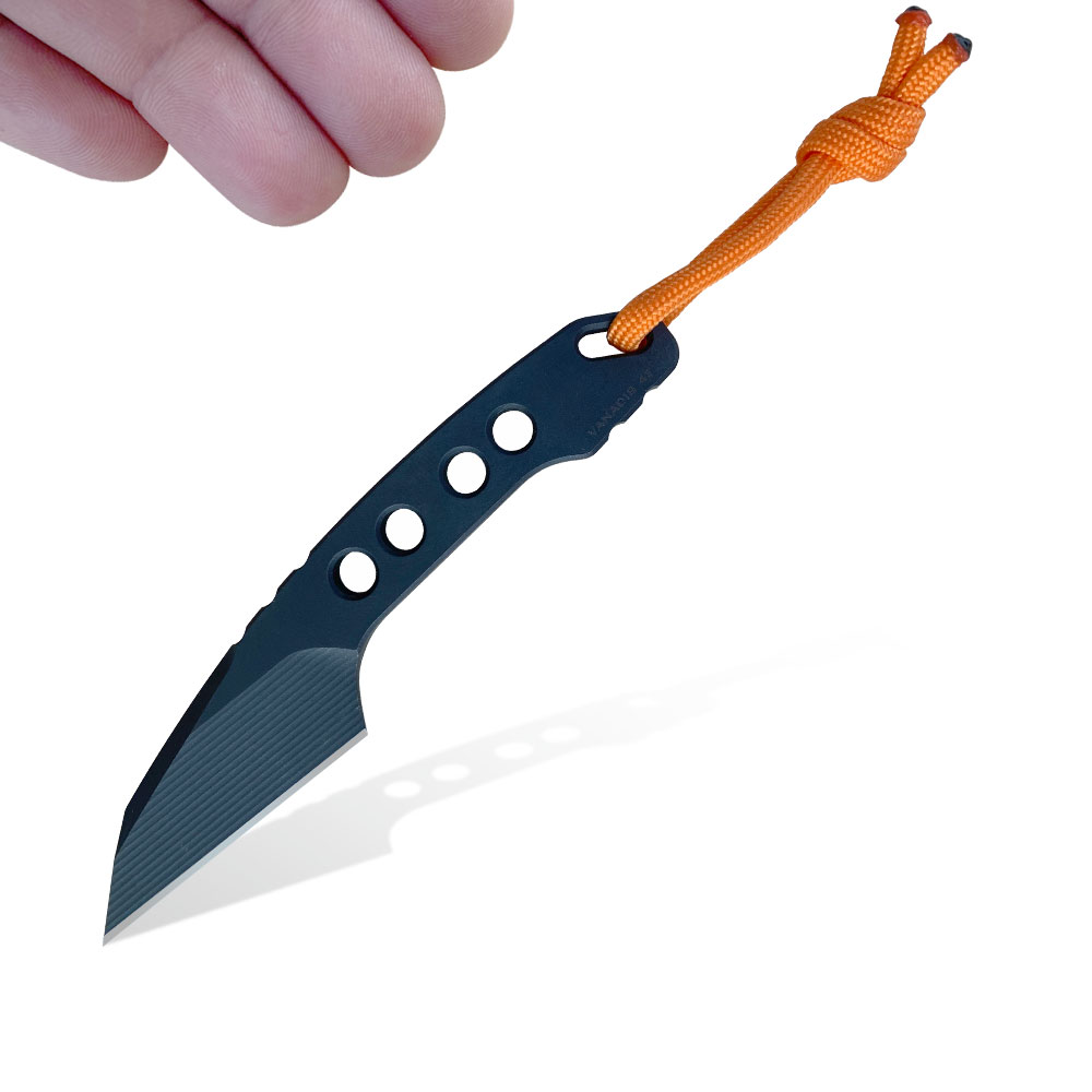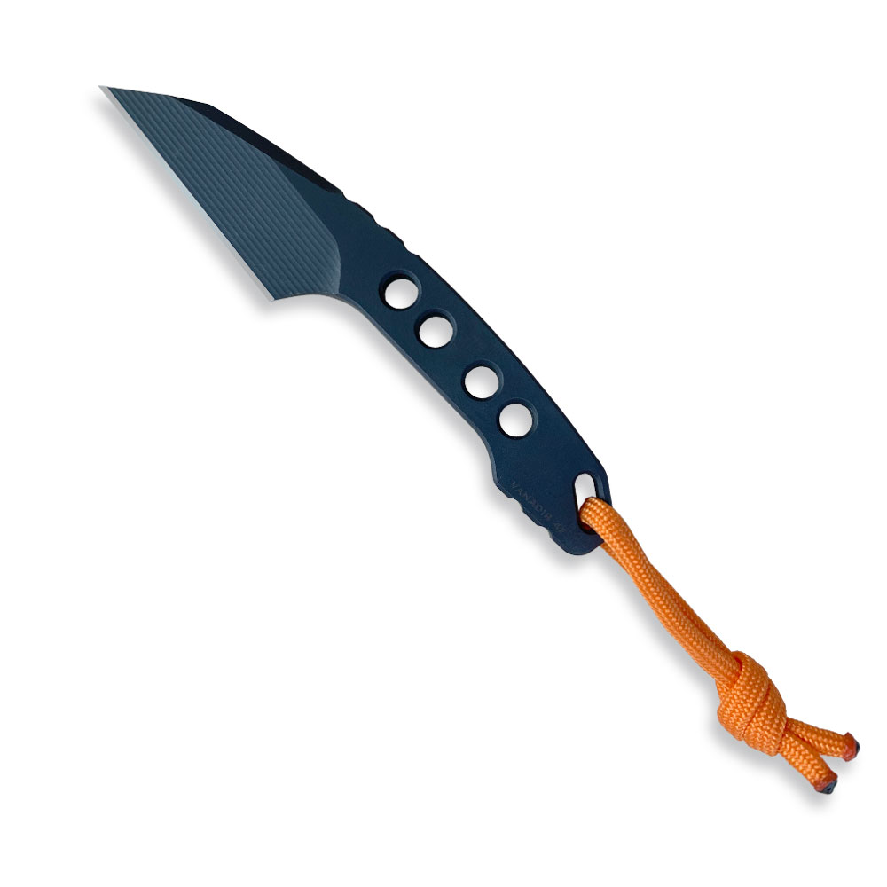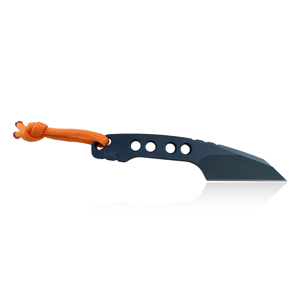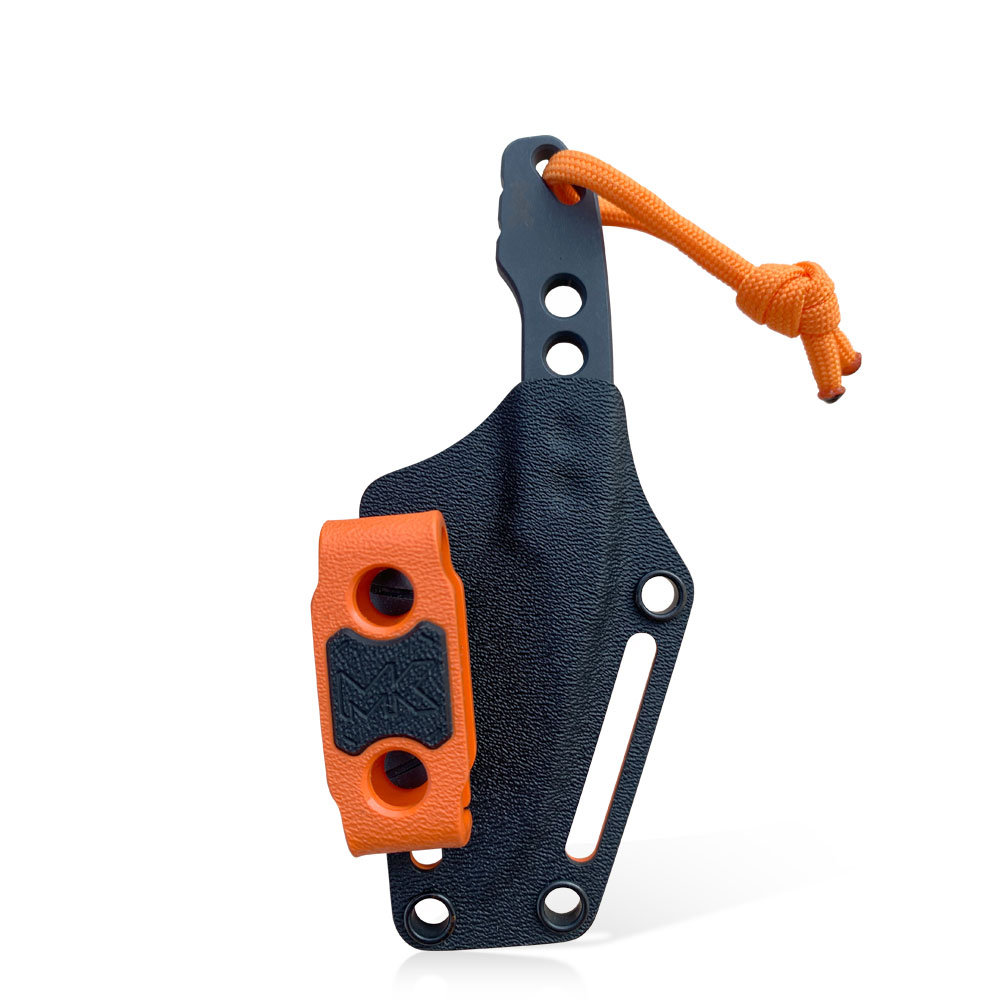 Niewielkie rozmiary, ale duże możliwości! Skuteczne ostrze typu wharncliffe ze świetnej stali Vanadis 4 Extra, tym razem w grubości aż 5 mm oraz czarnej powłoce tytanowej (PVD). Do tego niesztampowa dwukolorowa – łącząca czerń i pomarańcz kabura z kydexu. W klamrze po raz pierwszy zastosowano wstawkę z logiem MK, co z pewnością urozmaica projekt. Kabura posiada możliwość przenoszenia przy pasku w pionie lub w poziomie, oraz z opcję przenoszenia na szyi (nóż typu neck). Zgrabna całość zamknięta w pięknym projekcie, wykonana w niezwykłym, drobiazgowym stylu MK Knives & Tools.
