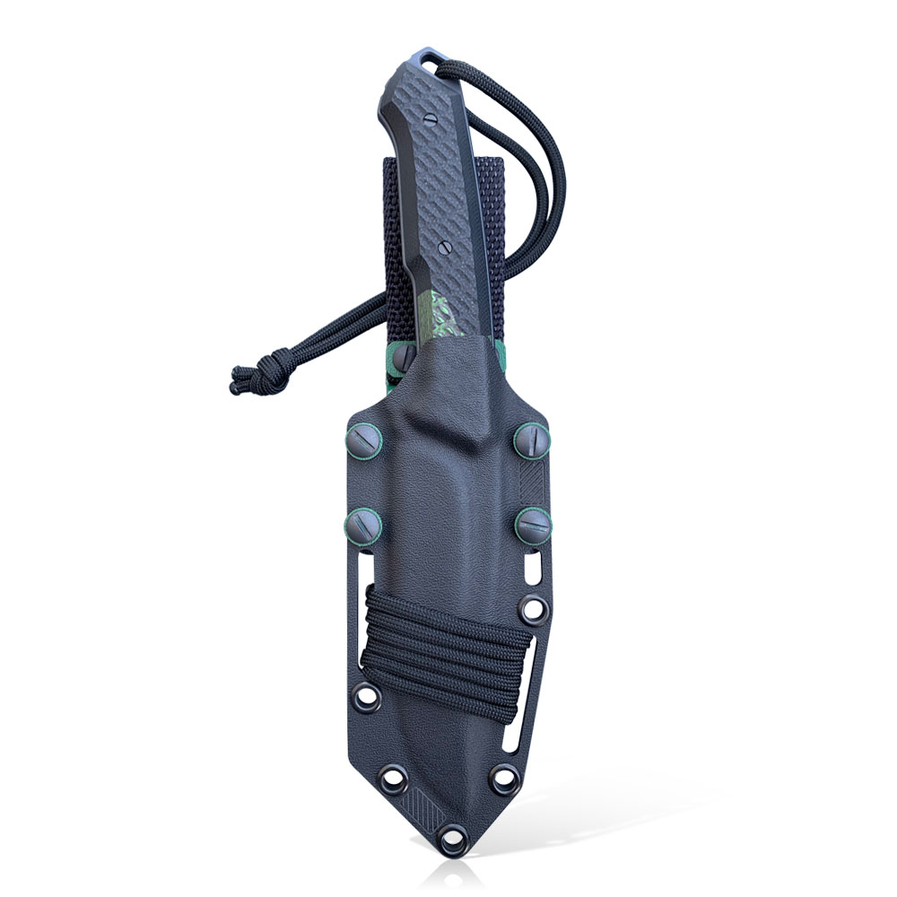 Nóż posiada kaburę z ręcznie formowanego tworzywa Kydex cechującego się wysoką odpornością na uderzenia, zarysowania, charakteryzującego się niską chłonnością wilgoci, odpornego na różnorodne warunki atmosferyczne oraz wiele środków chemicznych. W prezentowanym modelu kabura zrobiona została z materiału w kolorze czarnym i uzupełniona dodatkami w kolorze dobranym do ubarwienia rękojeści.