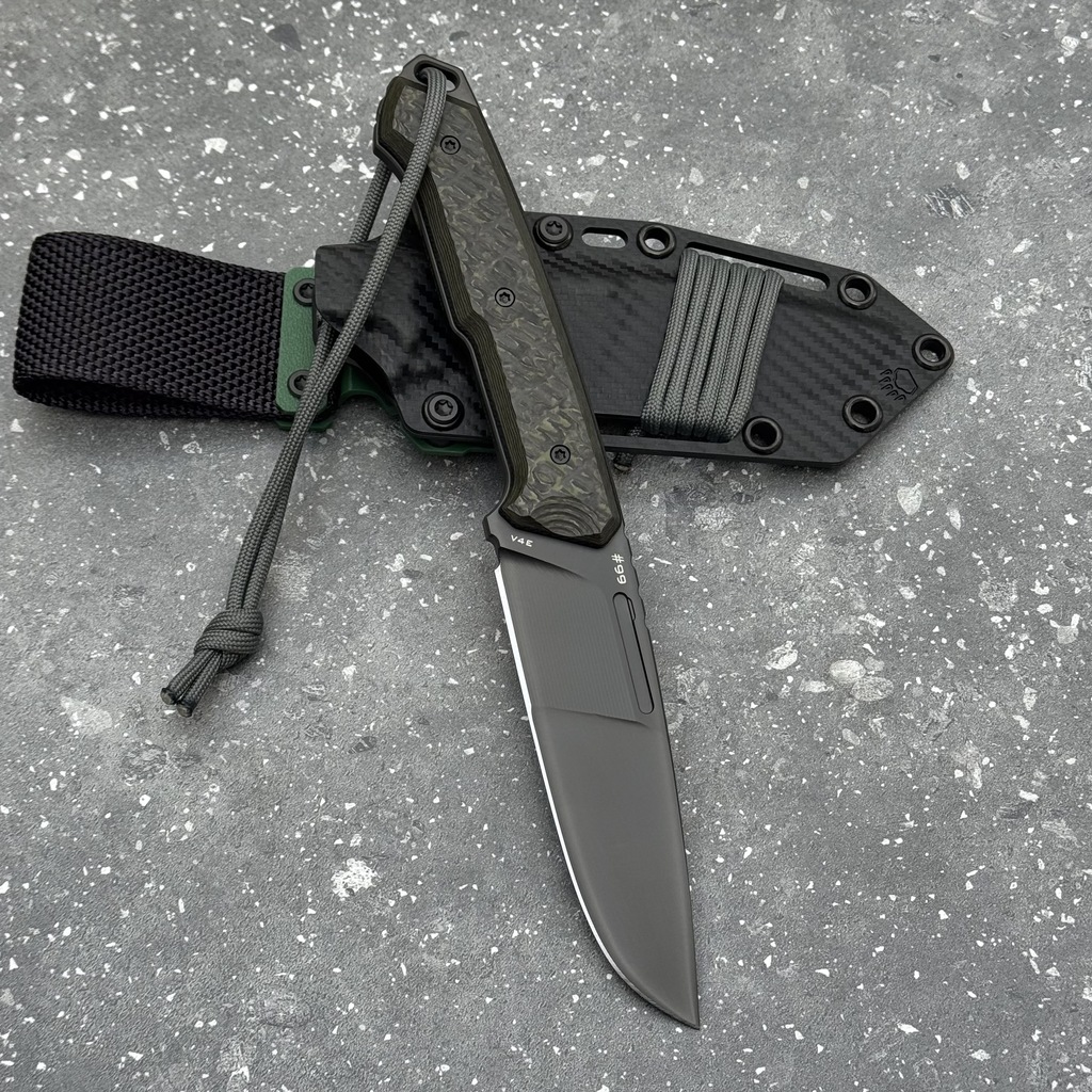 **EKSKLUZYWNY MATERIAŁ RĘKOJEŚCI**: Okładki rękojeści wykonane zostały z ekskluzywnego włókna węglowego, znanego dzisiaj na całej kuli ziemskiej producenta tego materiału z Litwy: FatCarbon. Całość wzmocniono przekładkami (linersy) z bardzo wytrzymałego kompozytu G10. G10 jest odporny na wilgoć, zmiany temperatury, większość rozpuszczalników i kwasów, posiada wysoką odporność na uszkodzenia mechaniczne. W prezentowanym nożu materiał okładek posiada chropowaty wzór zapobiegający ślizganiu się rękojeści w dłoni. Okładki rękojeści zostały skręcone stalowymi śrubami Torx o wykończeniu spójnym z wykończeniem ostrza.