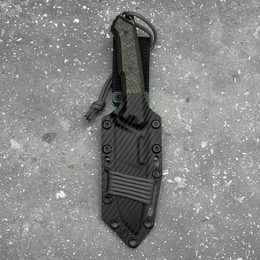 • Okładziny rękojeści wykonano z ekskluzywnego włókna węglowego FatCarbon w odmianie „Forest Green” z czarnymi przekładkami z laminatu G10 (liners). W zestawie znajduje się czarna kabura z tworzywa Holstex o wierzchnim wzorze włókna węglowego (carbon pattern) z zielonymi dodatkami kolorystycznymi. Niuanse występujące na ostrzu, kolorystyka rękojeści oraz piktogramy na kaburze są charakterystyczne dla serii „Fear The bear”.