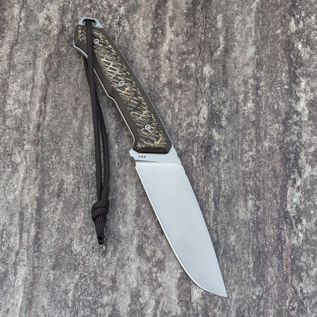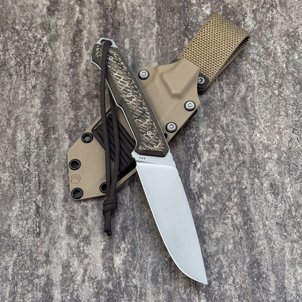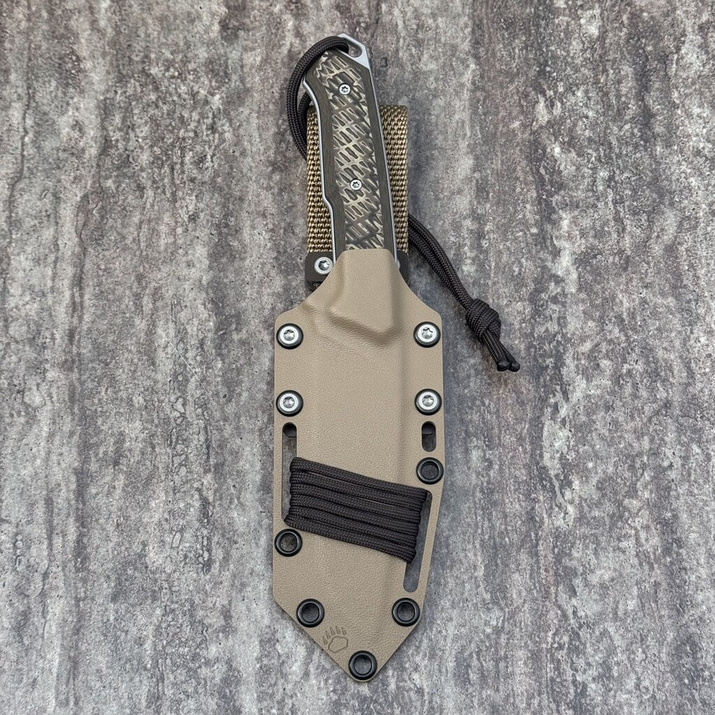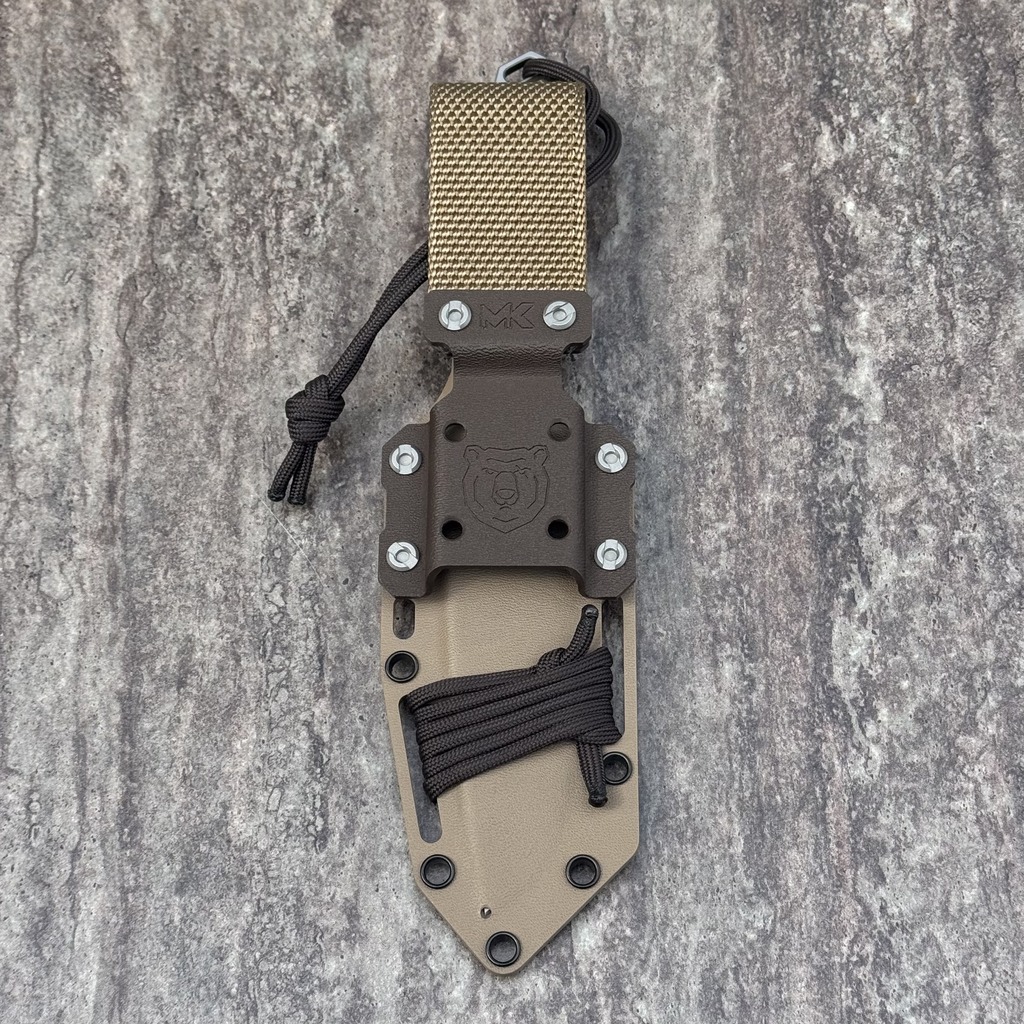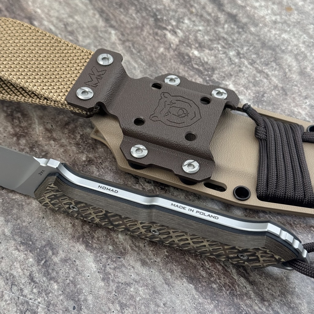 Nóż MK Knives & Tools Nomad „Fear The Bear” Bead Blasted Vanadis 4 Extra Richlite Dalhalla & Black G10 Liners FDE Fall Kydex