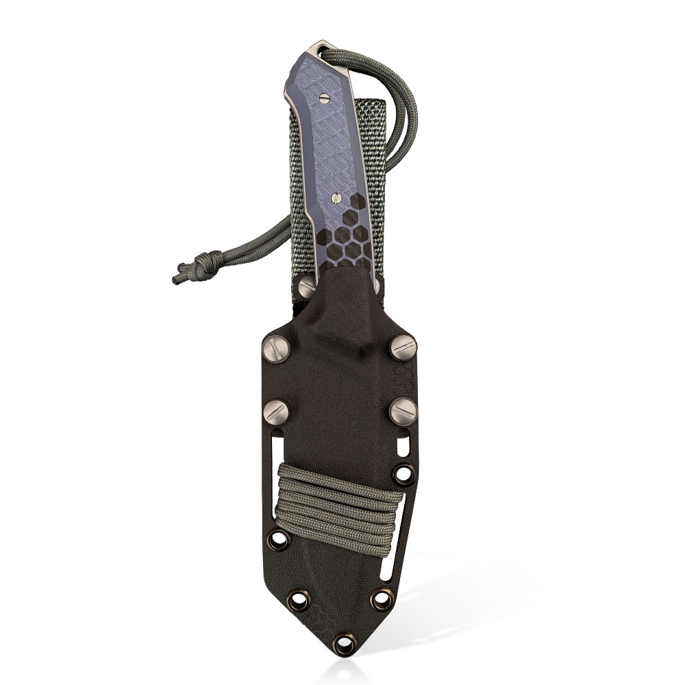 Nóż posiada kaburę z ręcznie formowanego tworzywa kydex cechującego się wysoką odpornością na uderzenia, zarysowania, charakteryzującego się niską chłonnością wilgoci, odpornego na różnorodne warunki atmosferyczne oraz wiele środków chemicznych. W prezentowanym modelu kabura zrobiona została z materiału w kolorze czarnym, uzupełniona kolorystycznymi dodatkami spójnymi z designem całości.