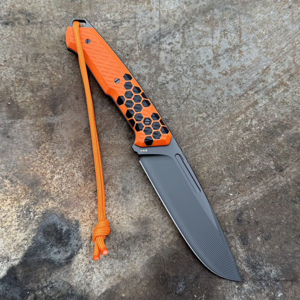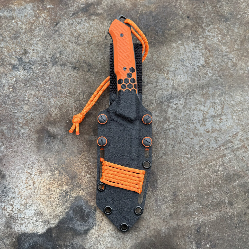 - Rękojeść: pomarańczowy G10 + czarne wypełnienia z żywicy epoksydowej