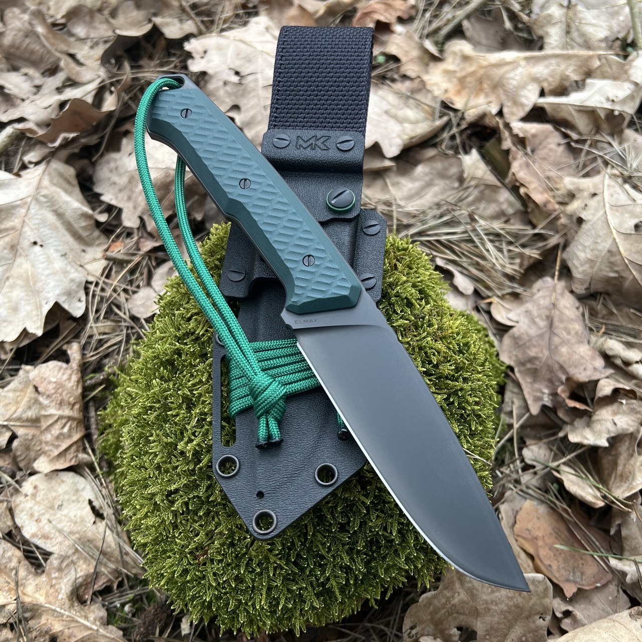 Nóż MK Knives & Tools Nomad „L6 #5” posiada ostrze ze stali premium Elmax z czarną powłoką DLC. Ostrze noża o profilu drop point posiada pełny szlif płaski (FFG – Dull Flat Grind). Okładki rękojeści wykonane zostały z zielonego kompozytu G10. W zestawie znajduje się czarna kabura Kydex. Kydex posiada możliwość zamontowania w pionie lub w poziomie (wzdłuż paska, co pozwala na dyskretne przenoszenie). Został też dostosowany do montażu na rozwiązaniach typu MOLLE, za sprawą specjalnie do tego zaprojektowanej, będącej elementem zestawu dodatkowej klamry, również z Kydexu.