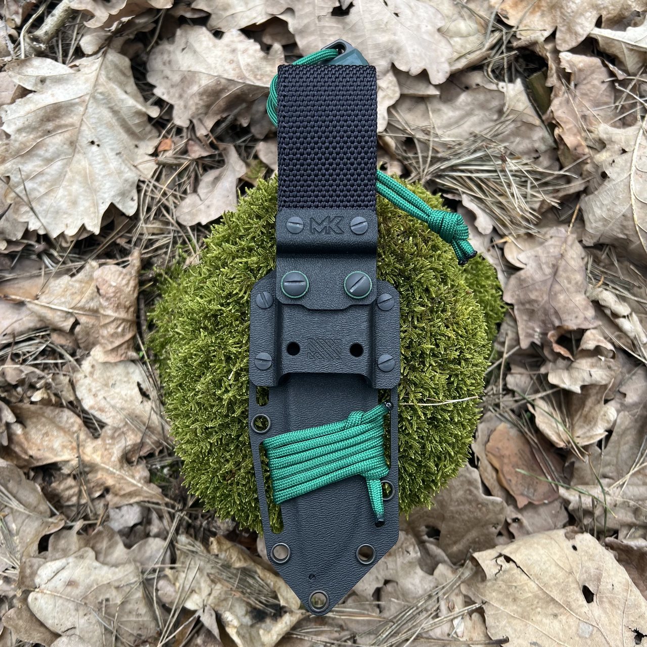 Kaburę możemy przenosić na kilka sposobów. Do pasa mocujemy ją za pomocą zrobionej z wytrzymałego nylonu o dużej gramaturze parcianej przelotki. Montaż na pasku, ale również na rozwiązaniach typu MOLLE zapewnia opcjonalna klamra Kydex dodawana do zestawu*. Kabura zaopatrzona została w otwory przelotowe, które można wykorzystać opcjonalnie do przytwierdzenia zestawu do plecaka czy elementu uprzęży taktycznej linką, sznurkiem czy paracordem. Można do tego oczywiście użyć zapasu paracordu, którym opleciona jest kabura (jego barwa odpowiada odcinkowi znajdującemu się przy nożu).
