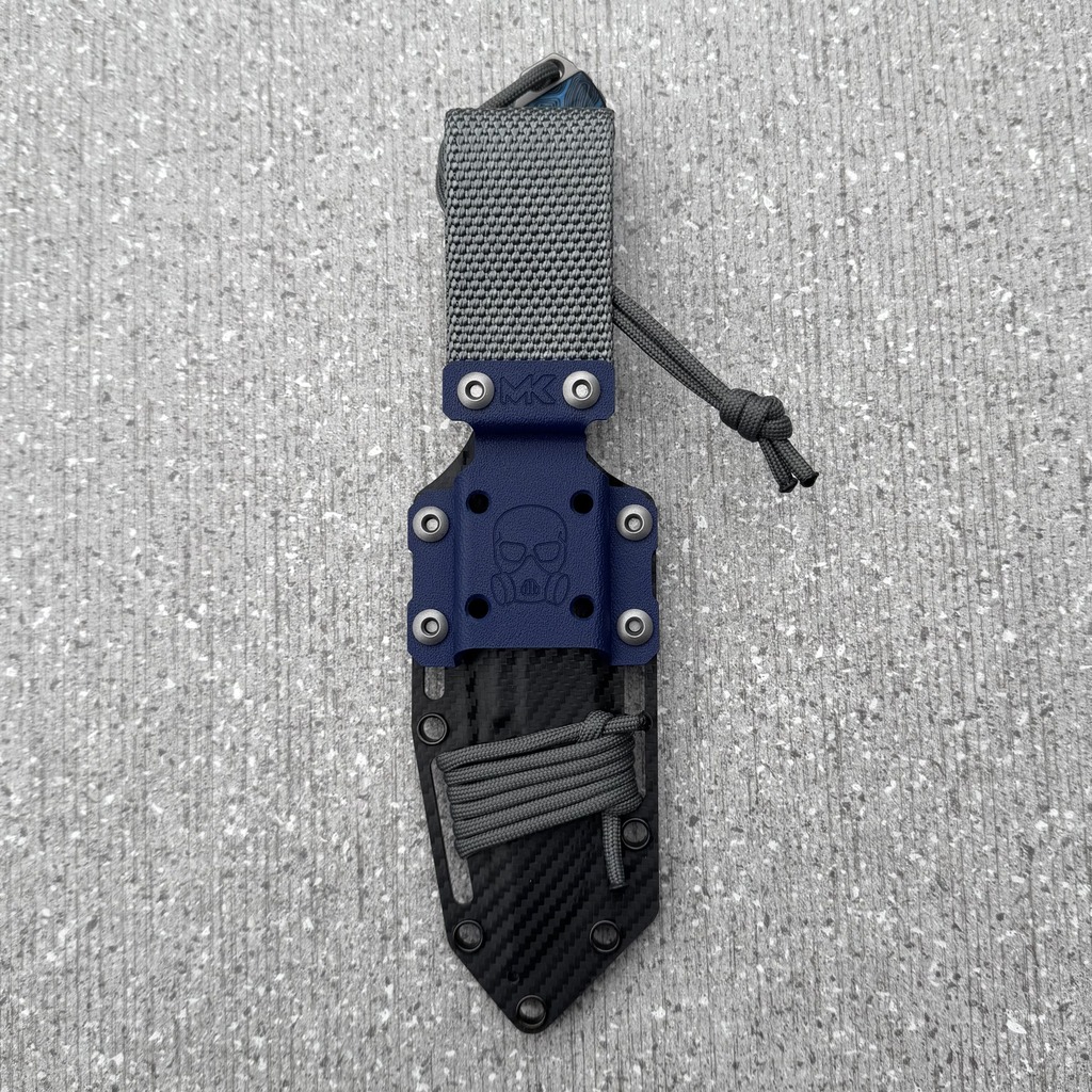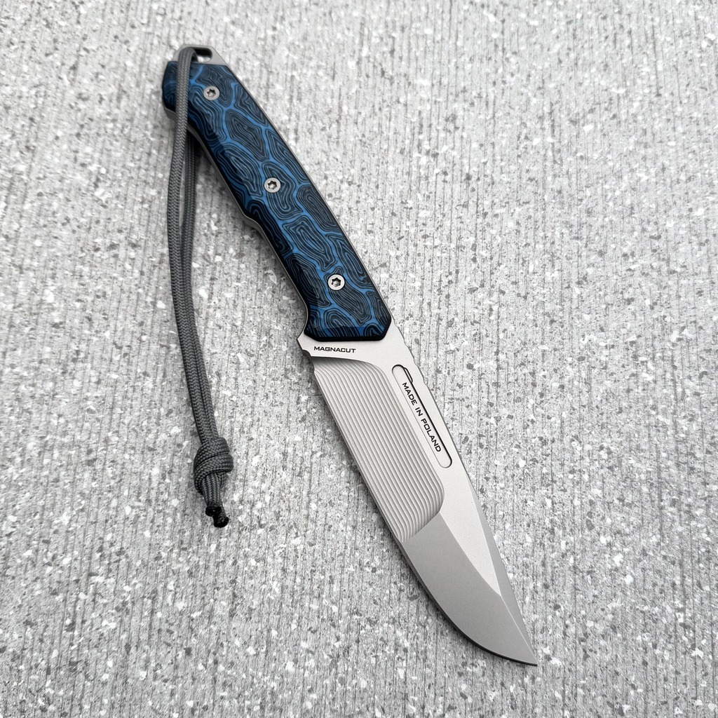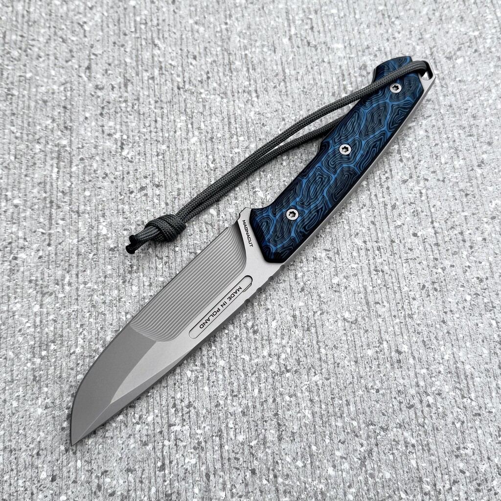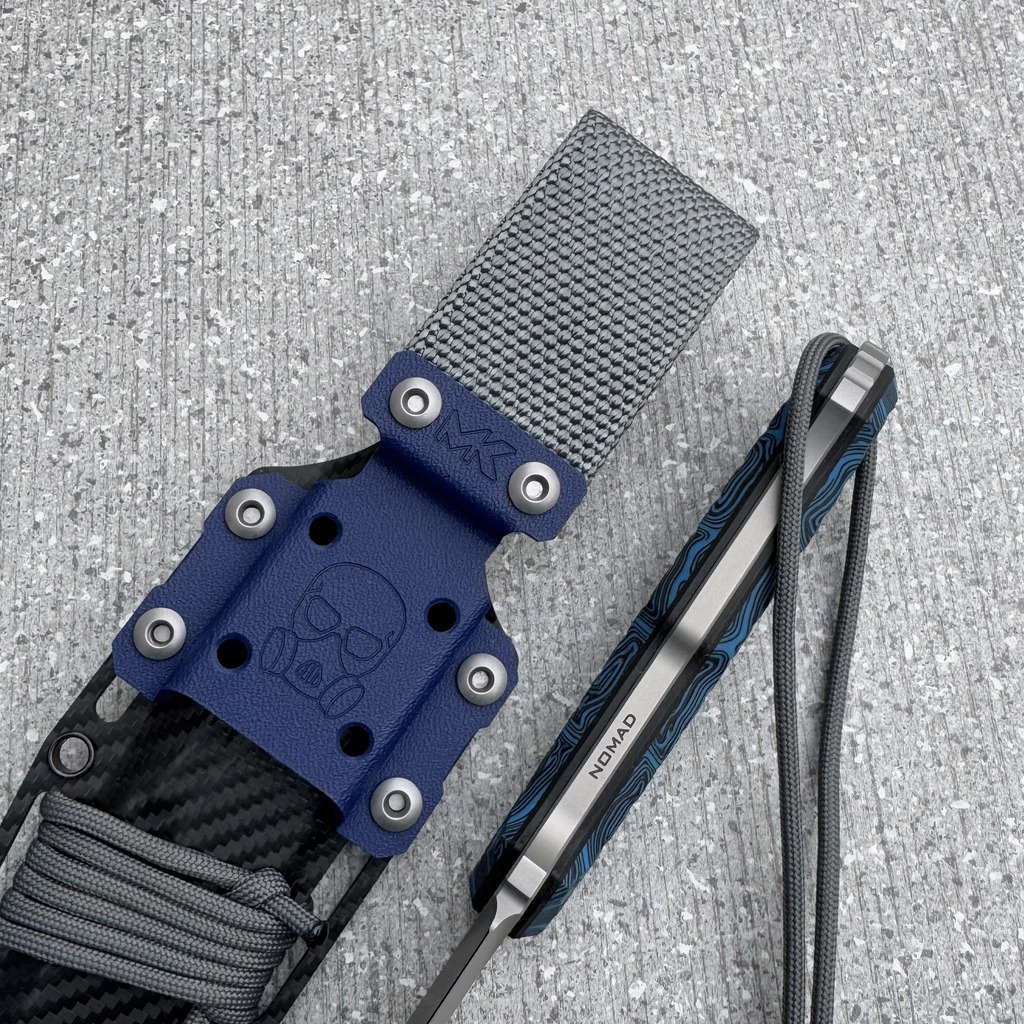 Nóż MK Knives & Tools Nomad „Postapo” Glass Blasted MagnaCut Double Grind Blue Turtle/Black G10 Black Carbon Holstex