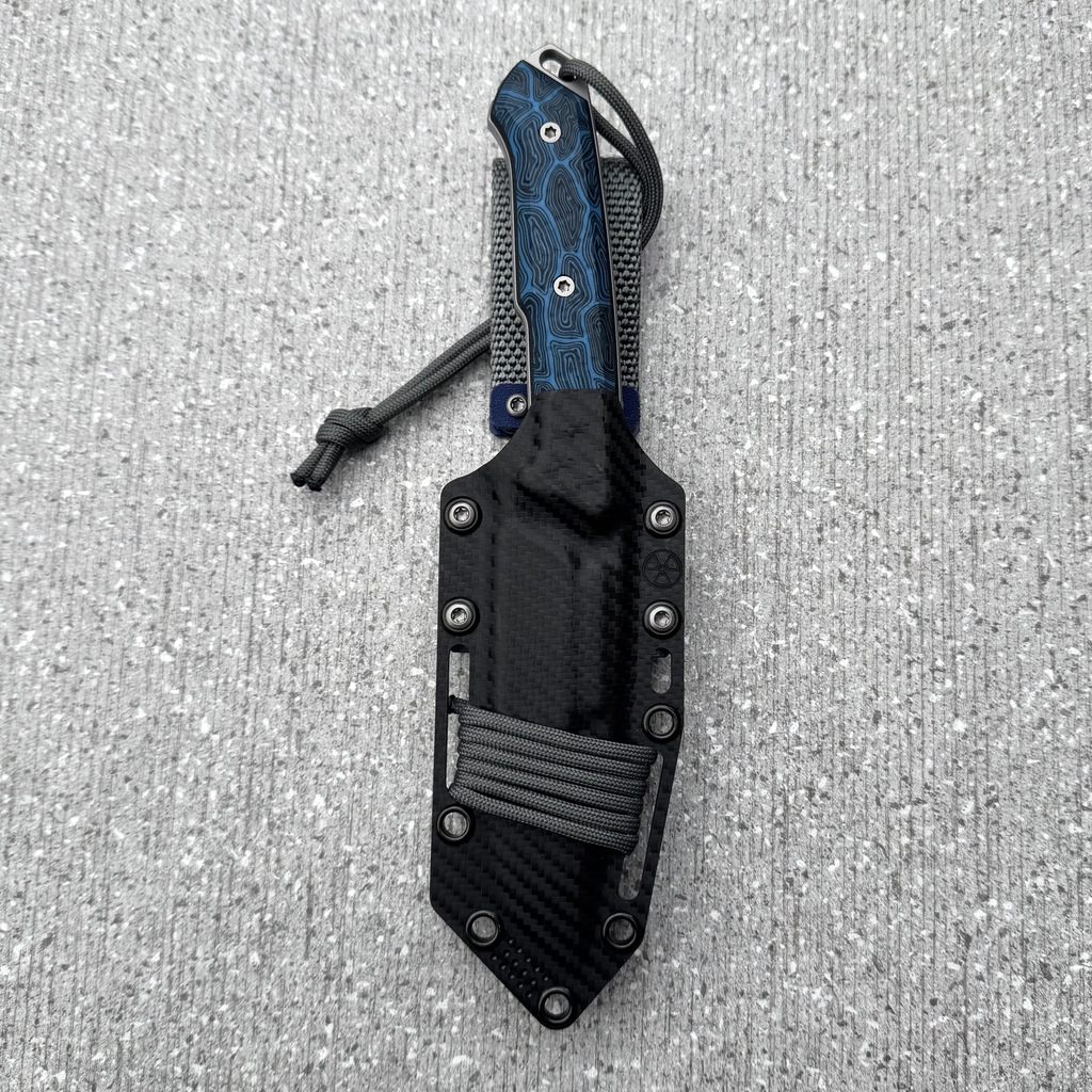 ***Okładziny rękojeści wykonano z fantazyjnego czarno-niebieskiego G10 z czarnymi linersami. W zestawie znajduje się czarna kabura z carbonowego Holstex’u z niebieskimi dodatkami.