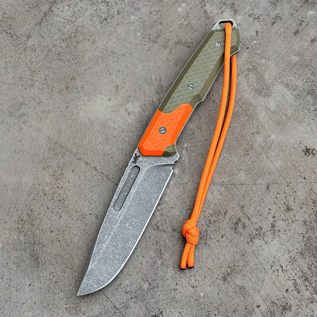 - Rękojeść: olive G10 + pomarańczowe wstawki