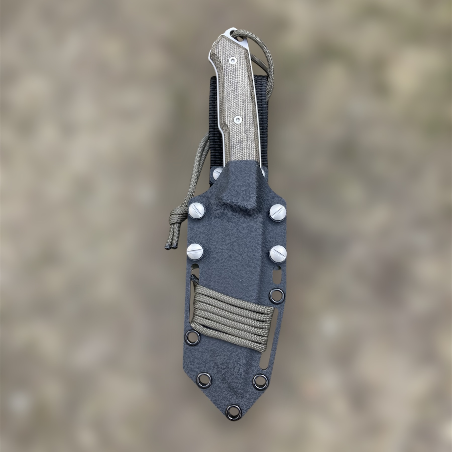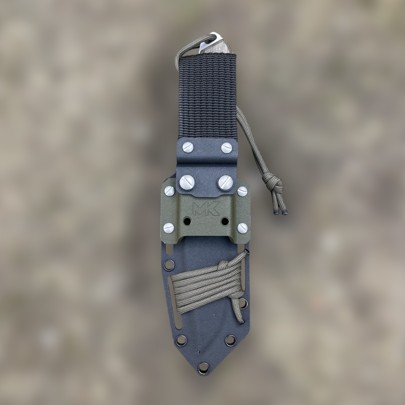 Kaburę do pasa mocujemy za pomocą tekstylnej przelotki. Kabura zaopatrzona została w otwory przelotowe, które można wykorzystać opcjonalnie do przytwierdzenia zestawu do plecaka czy elementu uprzęży taktycznej linką, sznurkiem czy paracordem. Można do tego oczywiście użyć zapasu paracordu, którym opleciona jest kabura (jego barwa odpowiada odcinkowi znajdującemu się przy nożu).