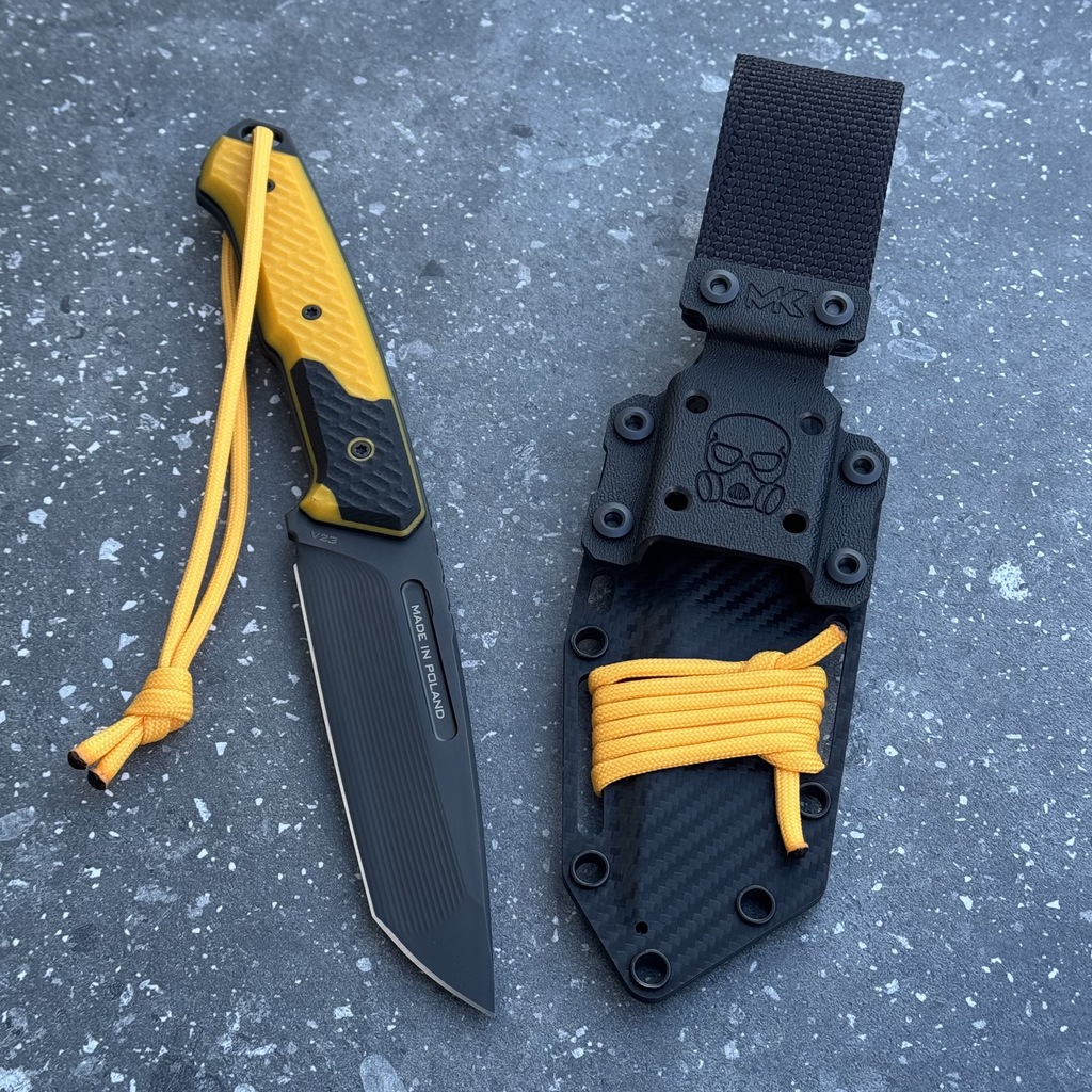 Nóż MK Knives & Tools Nomad Tanto „Postapo Bumblebee” DLC Vanadis 23 Yellow/Black G10 Black Carbon Holstex
