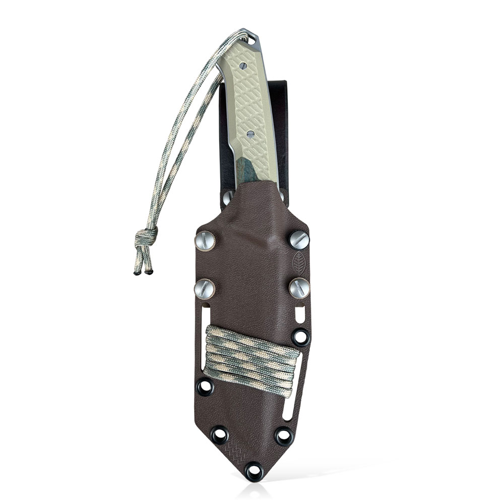 Nóż posiada kaburę z ręcznie formowanego tworzywa kydex, cechującego się wysoką odpornością na uderzenia, zarysowania, charakteryzującego się niską chłonnością wilgoci, odpornego na różnorodne warunki atmosferyczne oraz wiele środków chemicznych. W prezentowanym modelu kabura wykonana została z materiału o spójnym z całą koncepcją noża ubarwieniu oraz uzupełniona dobranymi przez knifemekera dodatkami kolorystycznymi. Kabura została skręcona śrubami ze stali nierdzewnej w wykończeniu odpowiadającym wykończeniu ostrza.