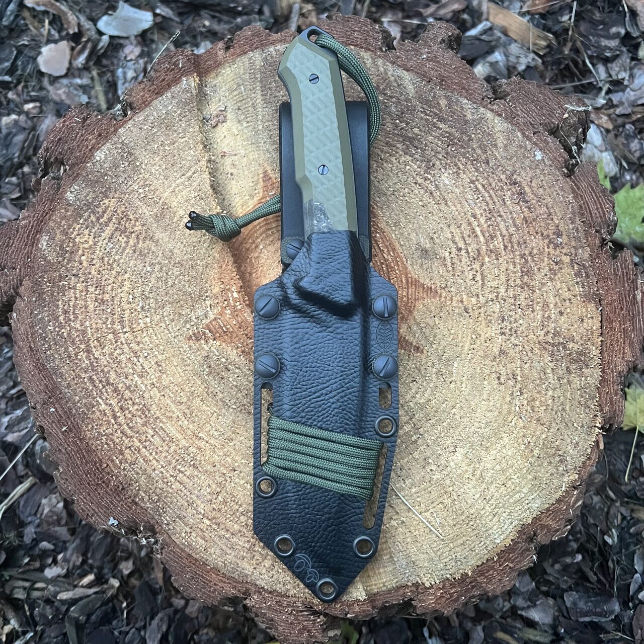 - Rękojeść: kompozyt G10 (oliwe) + wstawki z drewna stabilizowanego (klon falisty)