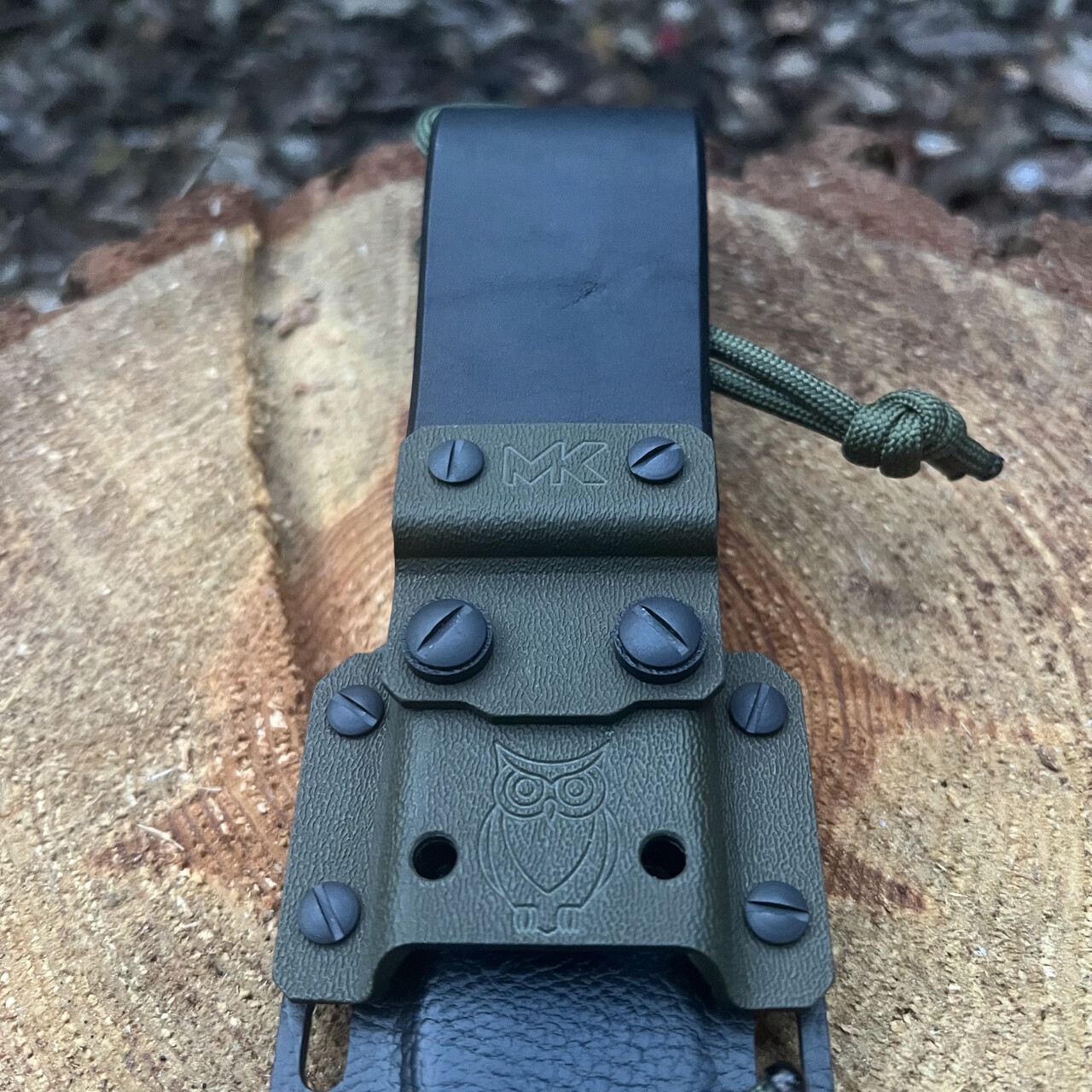 Nóż MK Knives & Tools Nomad „Wood Spirit” posiada ostrze ze stali premium Elmax z czarną powłoką DLC. Ostrze noża o profilu drop point wyprowadzone zostało szlifem rowkowym (wklęsły) dla uzyskania lepszych właściwości tnących. Okładki rękojeści wykonane zostały z kompozytu G10 (olive) z wstawkami z drewna stabilizowanego (klon falisty). W zestawie znajduje się czarna kabura holstex ze skórzaną przelotką na pasek. Kaburę ozdabiają charakterystyczne dla serii Wood Spirit piktogramy tematycznie związane z szeroko pojętą naturą: rzeka, liść, sowa.