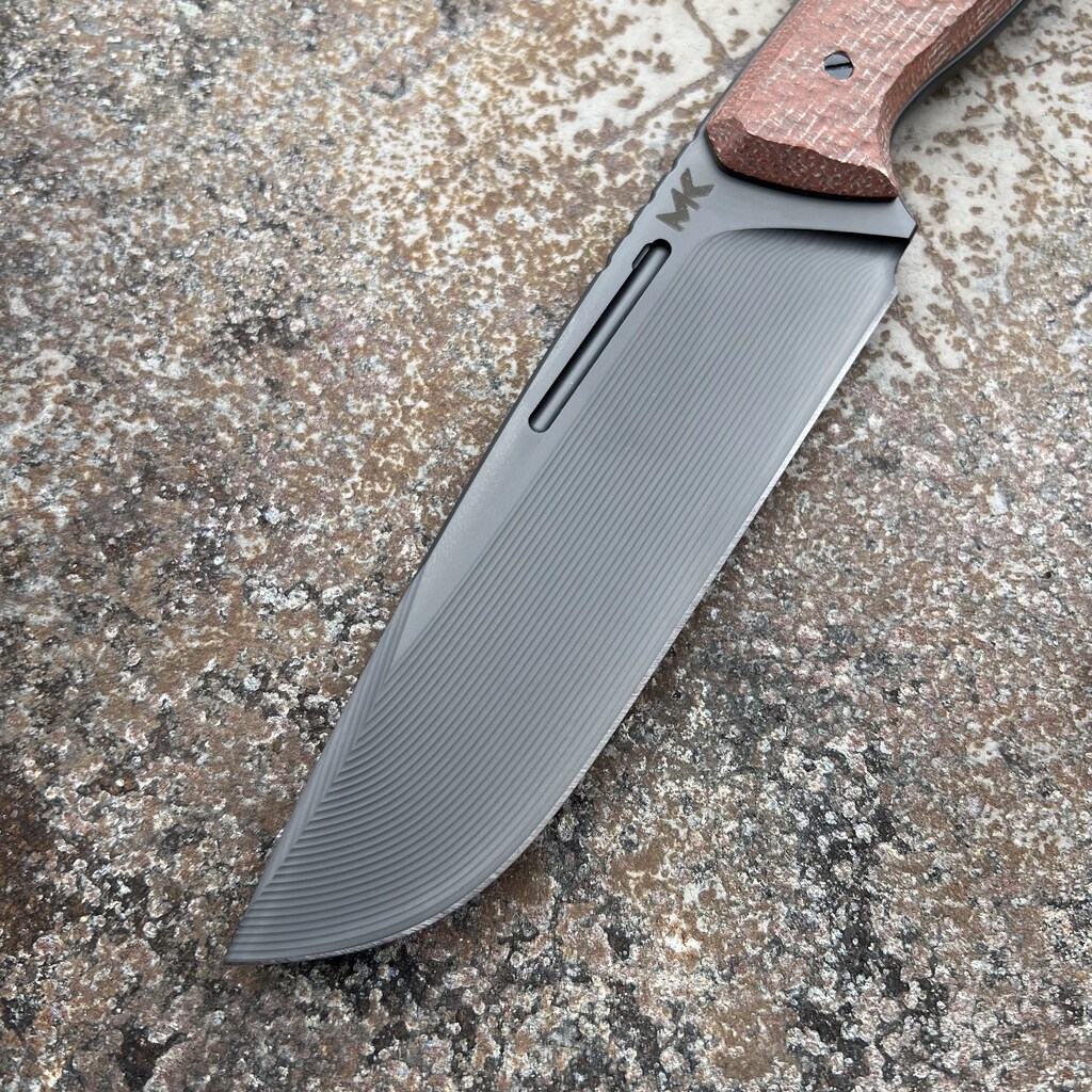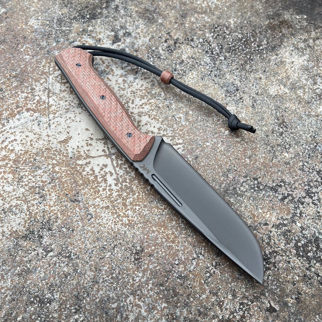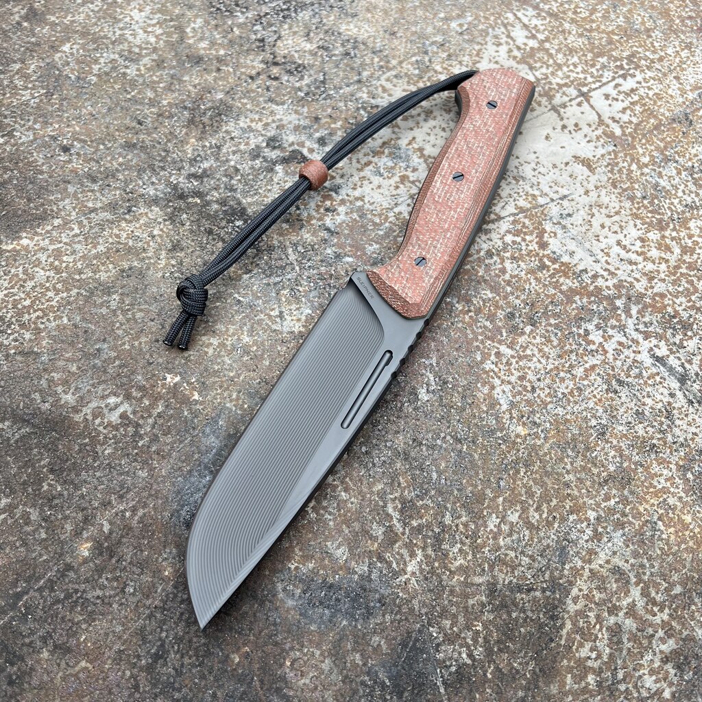 Okładziny rękojeści o ergonomicznym, zowalizowanym kształcie wykonane zostały z customowej micarty. Micarta to materiał, który jest odporny na wilgoć, zmiany temperatury, większość rozpuszczalników i kwasów, posiada wysoką odporność na uszkodzenia mechaniczne. W prezentowanym nożu materiał okładek posiada frezowany wzór zapobiegający ślizganiu się rękojeści w dłoni. Okładki rękojeści zostały skręcone stalowymi śrubami spójnymi z odcieniem ostrza.