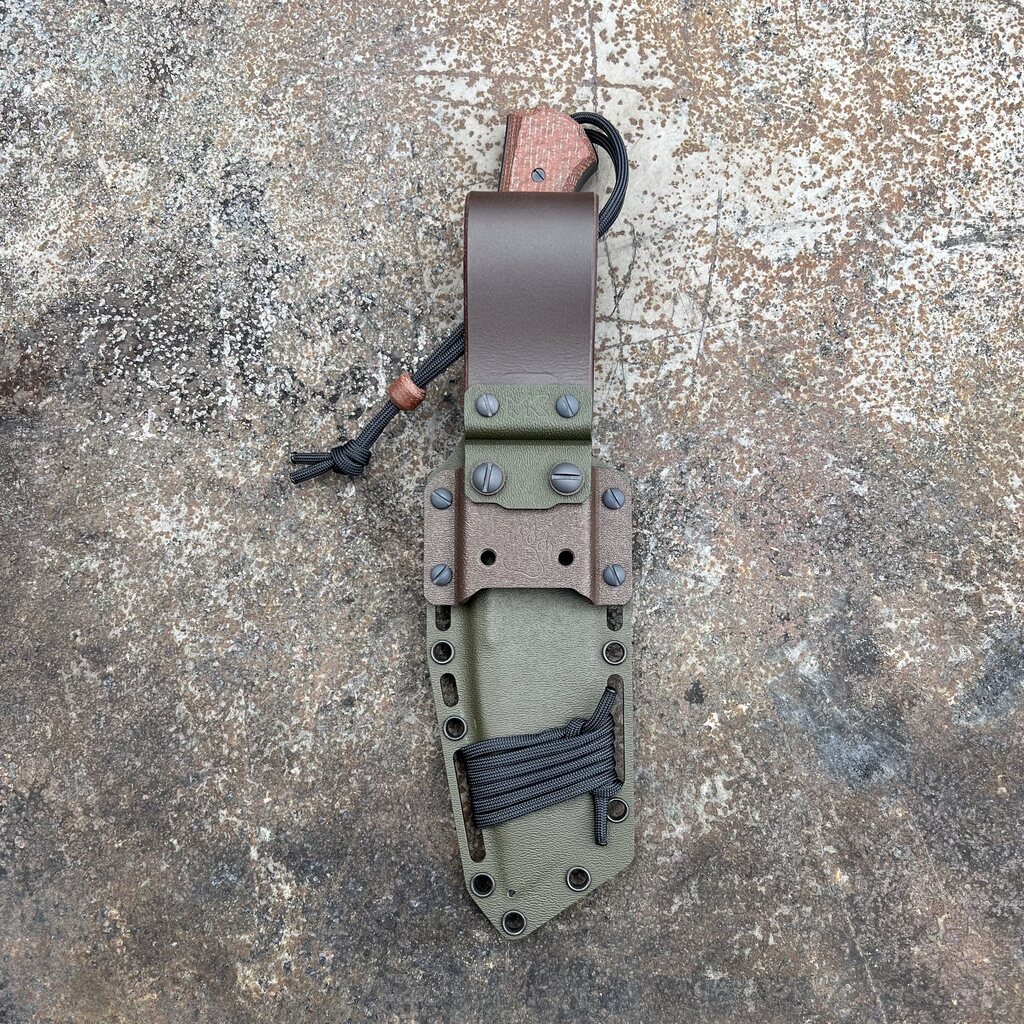 - Pokrowiec: zielona kabura kydex z brązowymi dodatkami, brązowa skórzana przelotka