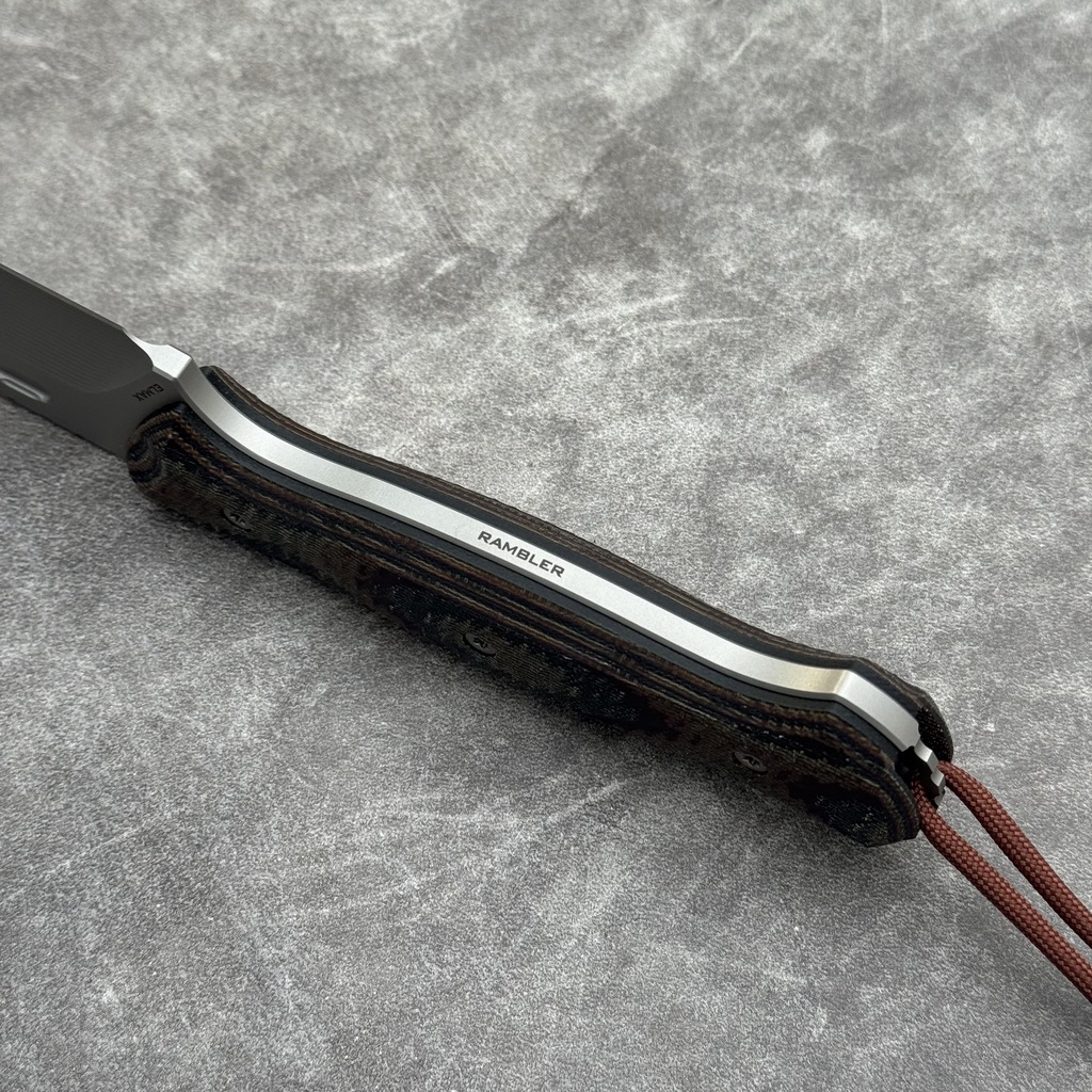 Nóż Rambler to solidne narzędzie dla jego użytkownika. Dość dużą rozmiarowo całość (260 mm całości), pewnie trzyma się w dłoni. Waga jest świetnie zbalansowana, wyczuwalna, dobrana tak, aby nie męczyć ręki gabarytem narzędzia. W budowie noża uwagę przykuwa ergonomiczna rękojeść o bardzo ładnej i stonowanej linii. Wyraźna linia chwytna rękojeści (zagłębienie), z powodzeniem na swojej powierzchni zmieści dłoń zarówno mniejszego jak i większego rozmiaru. Wyprofilowanie z jednej strony nie wymusza nienaturalnego ułożenia palców na rękojeści, a z drugiej zabezpiecza przeciwko wysunięcia się noża z dłoni nawet przy cięciu z tzw. 'rozmachem’. Zagłębienie spełnia również rolę podobną do działania jelca, z którego zrezygnowano w tym modelu.