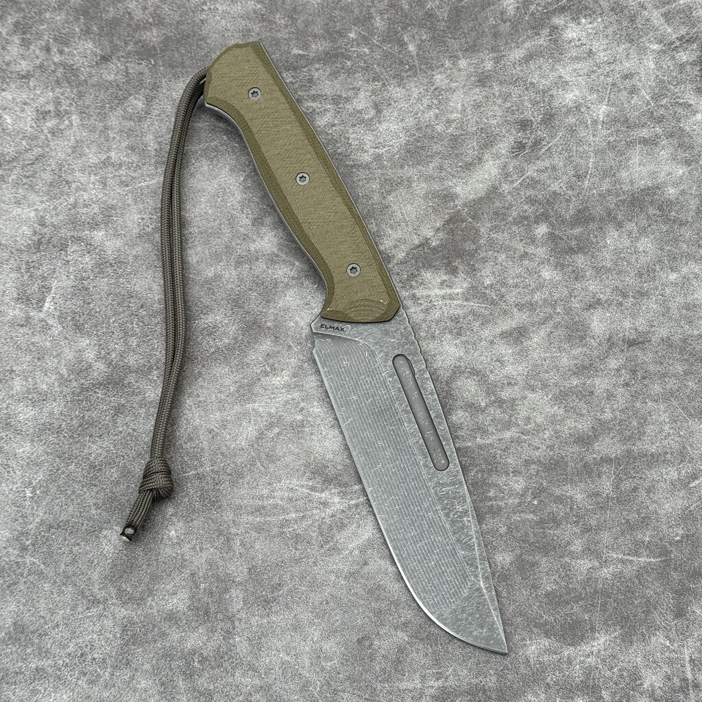 **Prezentowany nóż posiada ostrze z doskonałej europejskiej stali Elmax w wykończeniu ’stonewash’. Ostrze noża o profilu drop point wyprowadzone zostało szlifem rowkowym oprócz sztychu. Szlif to swoiste połączenie: szlifu rowkowego/wklęsłego na środku ostrza dającego świetne właściwości tnące i płaskiego od strony sztychu uwydatniający zdolności penetracyjne noża i wzmacniające je w tym rejonie. Okolicę grzbietową ostrza wyróżnia obustronne zbrocze (fuller) dodatkowo je balansujące.