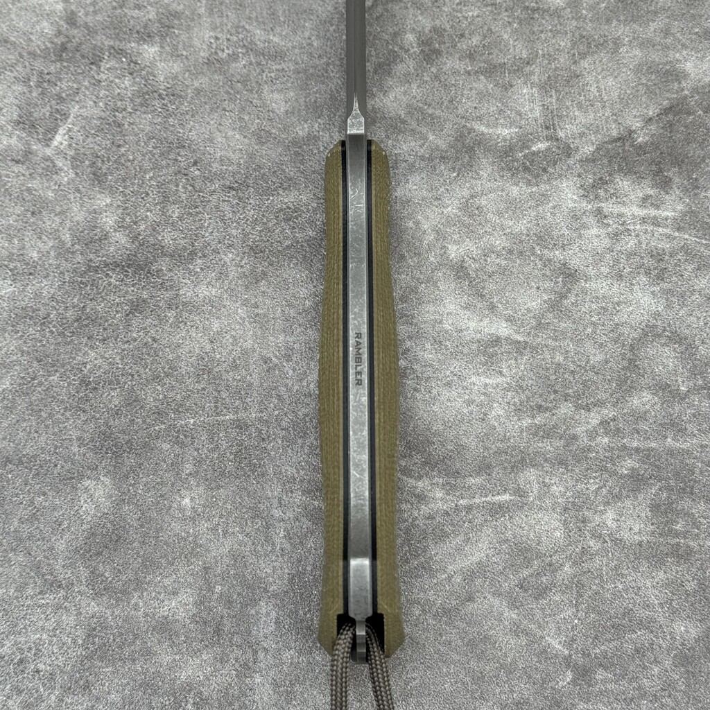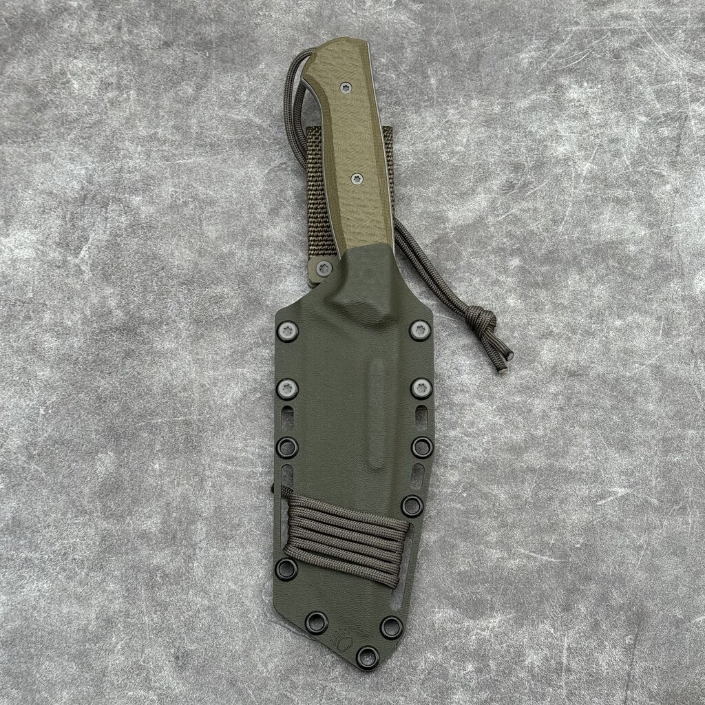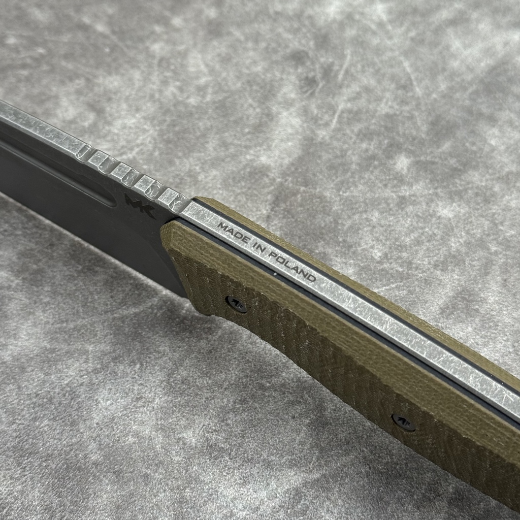 - Rękojeść: Olive Canvas Micarta + przekładki z czarnego G10