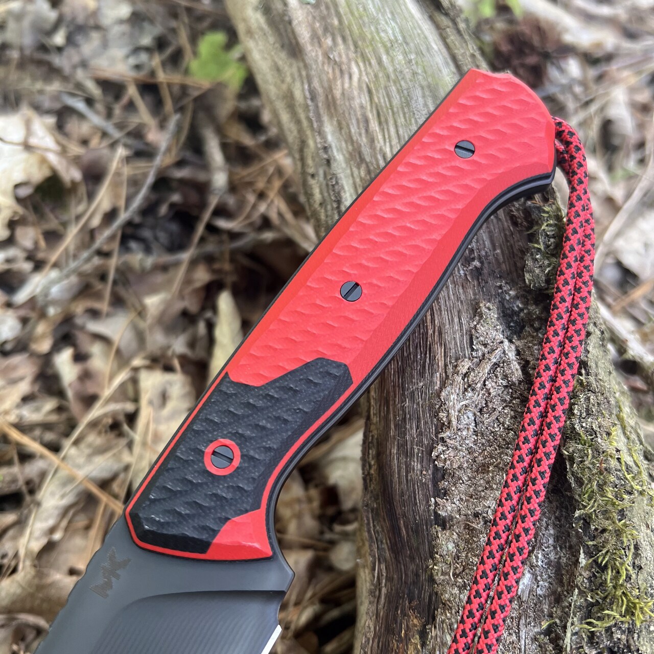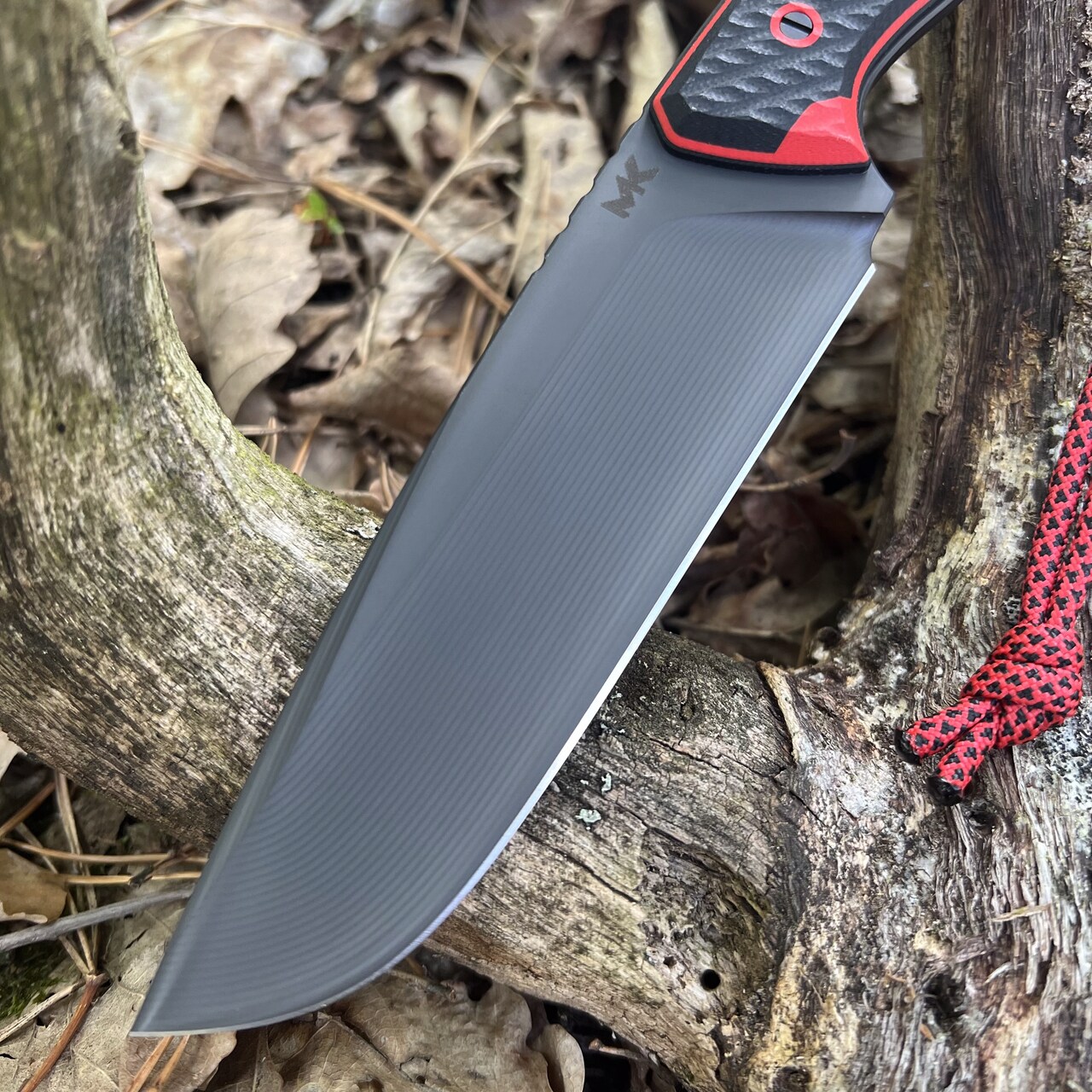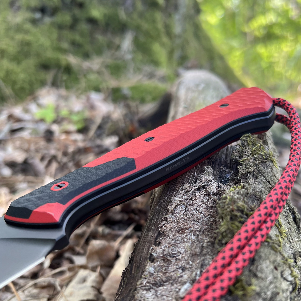 Nóż MK Knives & Tools Rambler „HGF2T #1” Bushcraftowy posiada ostrze z bardzo wytrzymałej i nierdzewnej stali Elmax, powleczone czarną powłoką DLC. Ostrze noża o profilu drop point wyprowadzone zostało szlifem rowkowym (wklęsły) dla uzyskania lepszych właściwości tnących. Okładki rękojeści wykonane z dwubarwnego, czerwono-czarnego kompozytu G10 kryją na jej zakończeniu pin na paracord / linkę itd. W komplecie z nożem otrzymujemy czarną kaburę z Kydexu z czerwonymi akcentami.