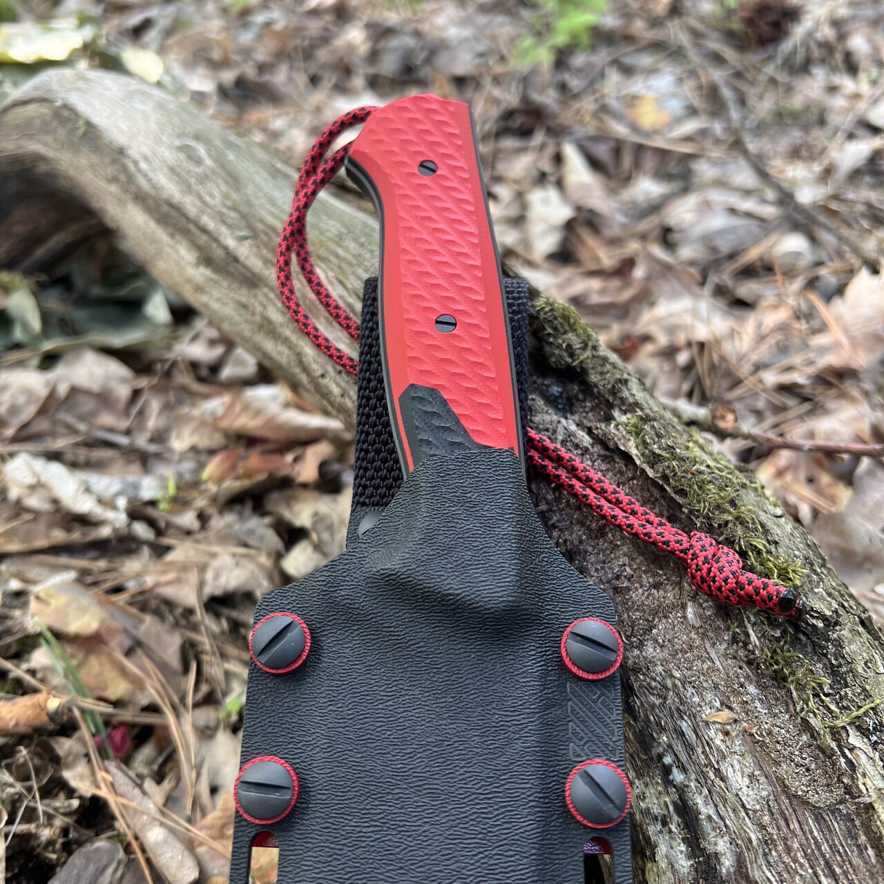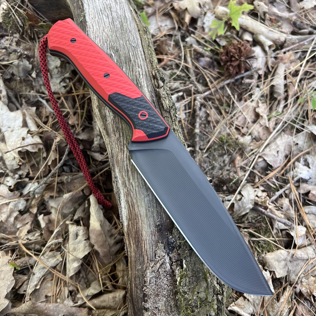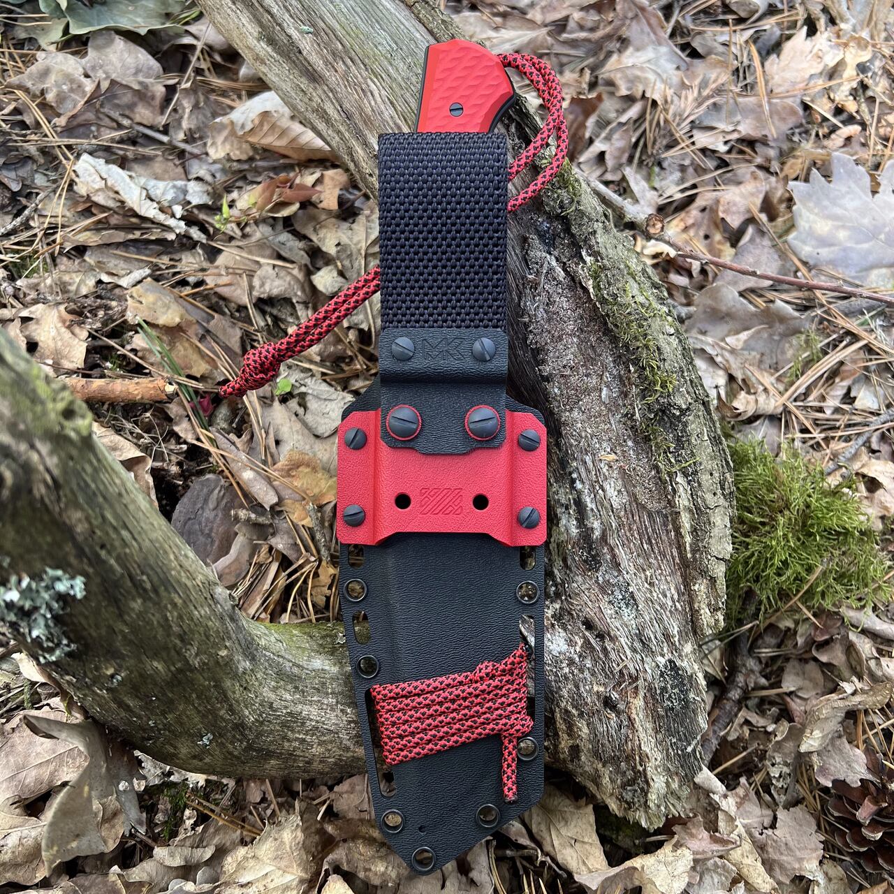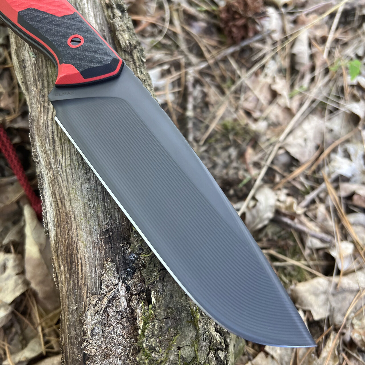 Nóż MK Knives & Tools Rambler „HGF2T #1” Bushcraftowy posiada ostrze z bardzo wytrzymałej i nierdzewnej stali Elmax, powleczone czarną powłoką DLC. Ostrze noża o profilu drop point wyprowadzone zostało szlifem rowkowym (wklęsły) dla uzyskania lepszych właściwości tnących. Okładki rękojeści wykonane z dwubarwnego, czerwono-czarnego kompozytu G10 kryją na jej zakończeniu pin na paracord / linkę itd. W komplecie z nożem otrzymujemy czarną kaburę z Kydexu z czerwonymi akcentami.