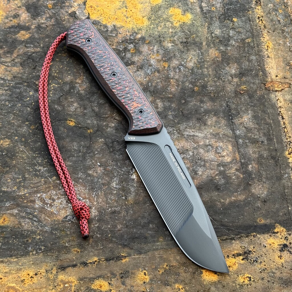**Prezentowany nóż posiada ostrze z ekstremalnie wytrzymałej stali Vanadis 23 o świetnej twardości (61-62 HRC), powleczone czarną powłoką DLC. Ostrze noża o profilu drop point wyprowadzone zostało podwójnym szlifem (DG – Double Grind). Szlif to swoiste połączenie: szlifu rowkowego/wklęsłego na środku ostrza dającego świetne właściwości tnące i płaskiego od strony sztychu uwydatniający zdolności penetracyjne noża i wzmacniające je w tym rejonie. Okolicę grzbietową ostrza wyróżnia obustronne zbrocze (fuller) dodatkowo je balansujące.