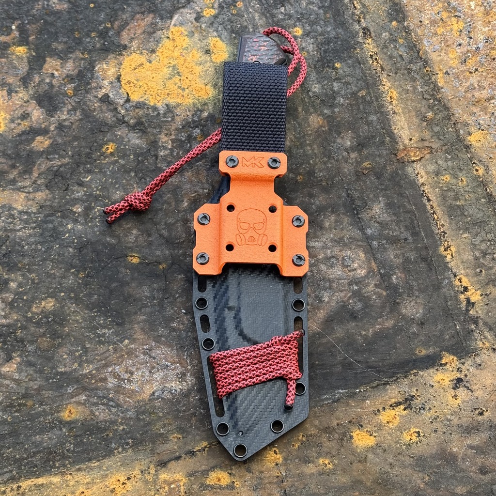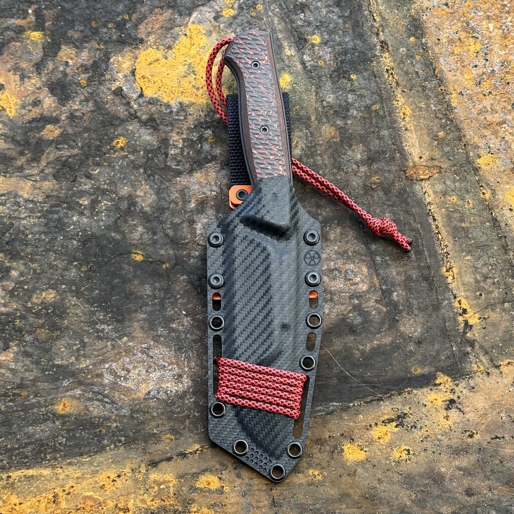 ***Okładki rękojeści wykonane zostały z ekskluzywnego włókna węglowego FatCarbon w odmianie 'Mars Valley’ z przekładkami z czarnego G10. Niuanse występujące na ostrzu, kolorystyka rękojeści oraz piktogramy na kaburze są charakterystyczne dla serii „Postapo”. W komplecie z nożem otrzymujemy kaburę z czarnego Holsexu (waór carbon) z czerwonymi dodatkami.