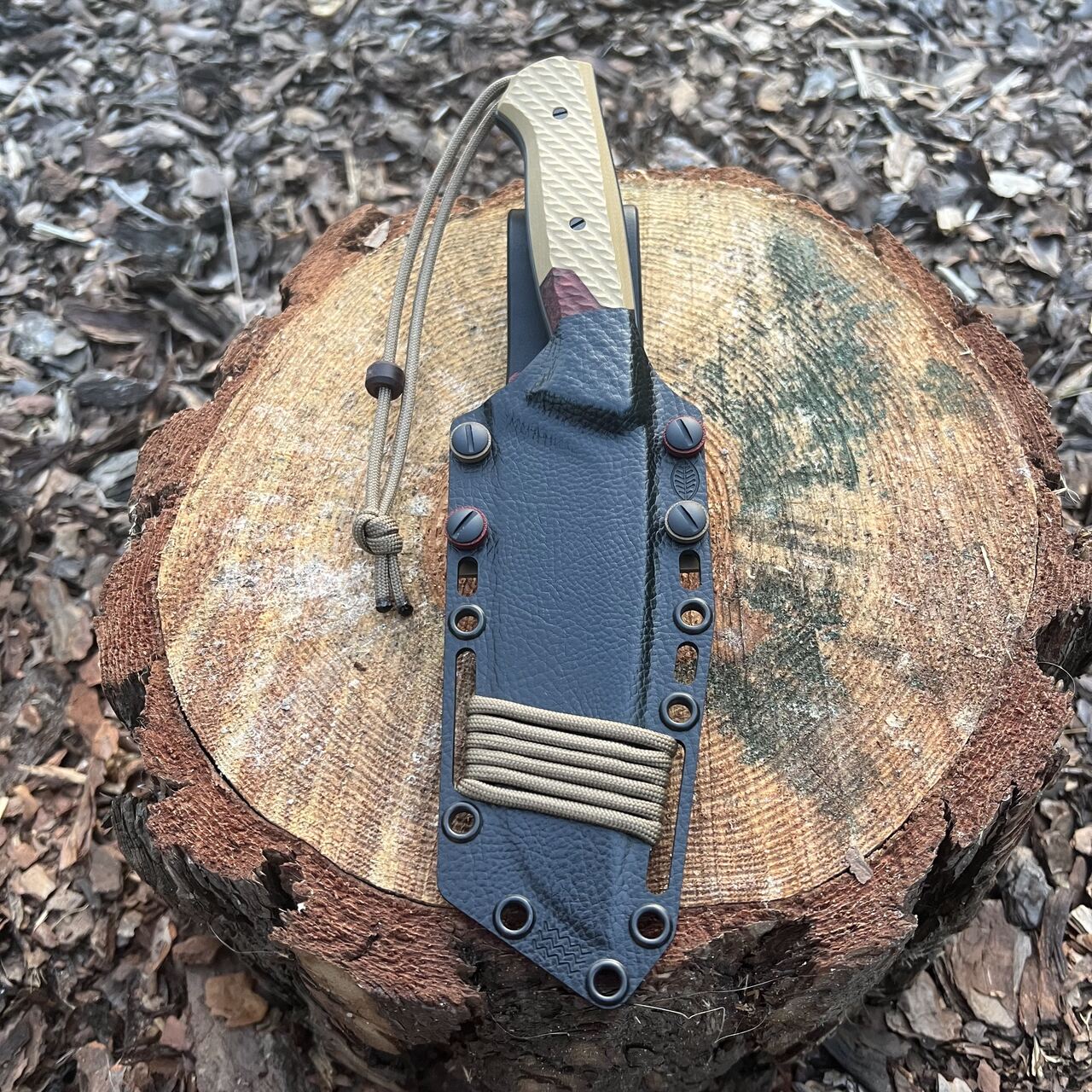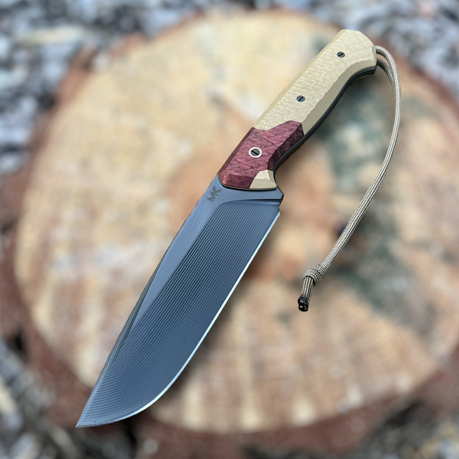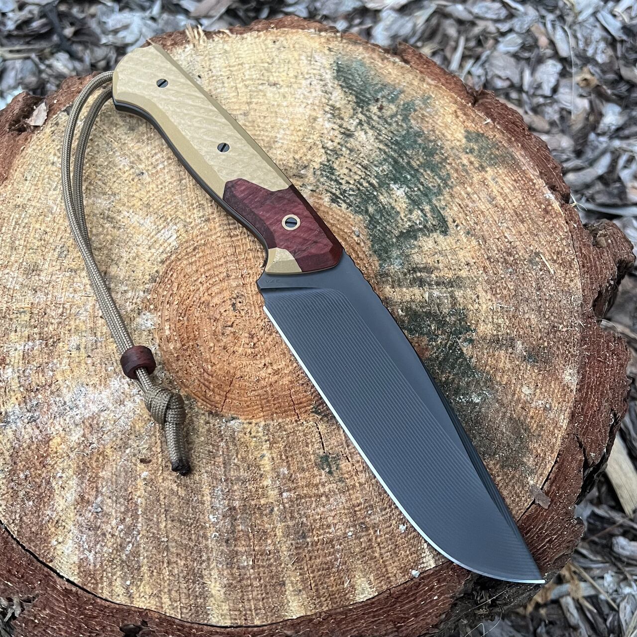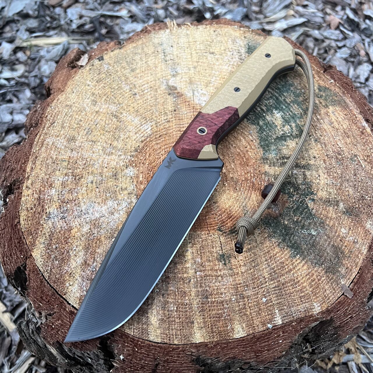 - Rękojeść: kompozyt G10 oraz wstawki z drewna stabilizowanego (zagrzybiony buk)