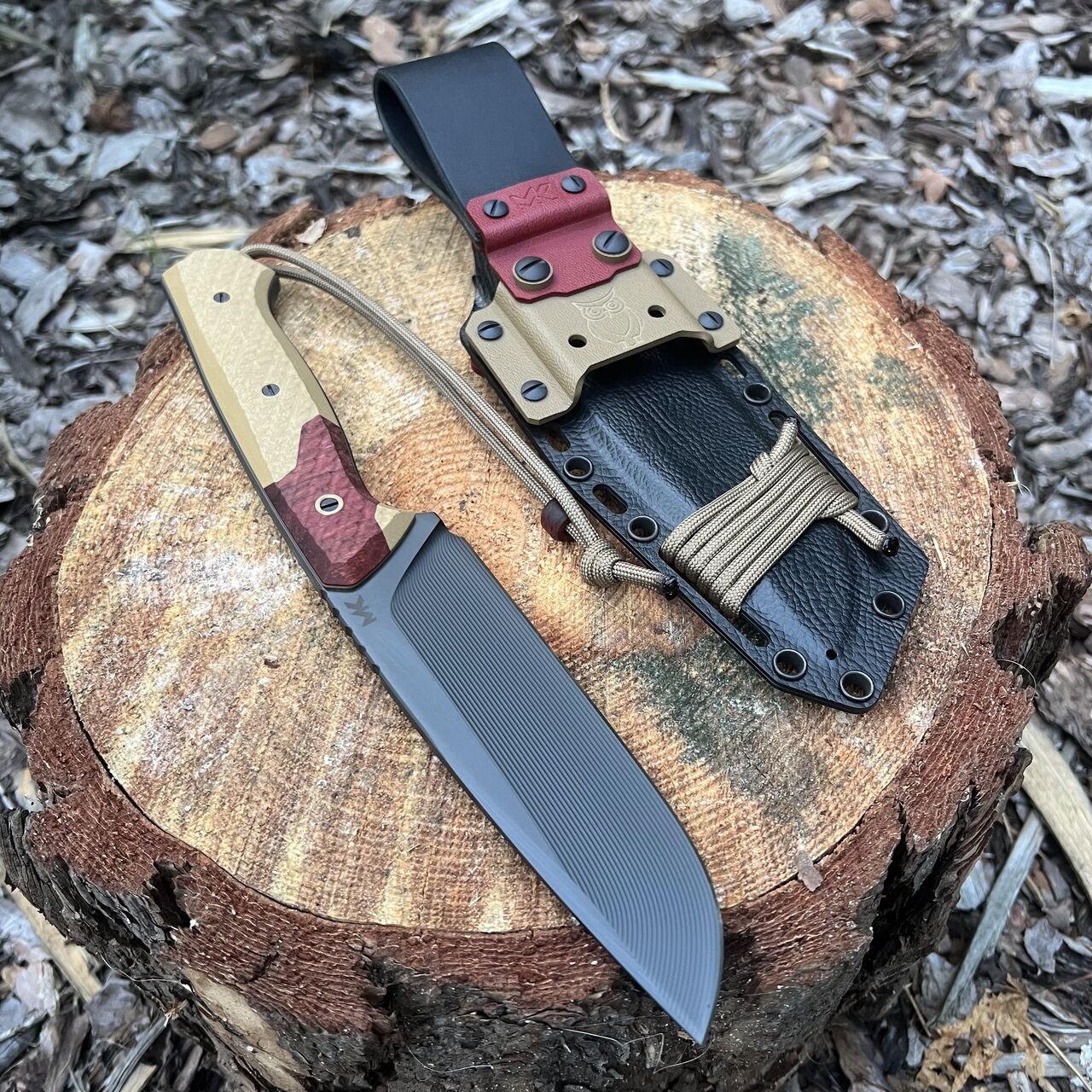 Nóż MK Knives & Tools Rambler „Wood Spirit” posiada ostrze z wyróżniającej się w zakresie odporności na przeciążenia stali Vanadis 4 Extra, powleczone czarną powłoką DLC. Ostrze noża o profilu drop point wyprowadzone zostało szlifem rowkowym (wklęsły) dla uzyskania lepszych właściwości tnących. Okładki rękojeści wykonane zostały z kompozytu G10 (Desert Tan) z wstawkami z drewna stabilizowanego (zagrzybiony buk). W zestawie znajduje się czarna kabura holstex ze skórzaną przelotką na pasek. Kaburę ozdabiają charakterystyczne dla serii Wood Spirit piktogramy tematycznie związane z szeroko pojętą naturą: rzeka, liść, sowa. Na dołączonym do noża paracordzie znajdziemy koralik z tego samego drewna stabilizowanego, które znajduje się w rękojeści.