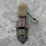 **OPCJE PRZENOSZENIA**. Kaburę do pasa mocujemy za pomocą tekstylnej przelotki. Kabura zaopatrzona została w otwory przelotowe, które można wykorzystać opcjonalnie do przytwierdzenia zestawu do plecaka czy elementu uprzęży taktycznej linką, sznurkiem czy paracordem. Można do tego oczywiście użyć zapasu paracordu, którym opleciona jest kabura (jego barwa odpowiada odcinkowi znajdującemu się przy nożu).