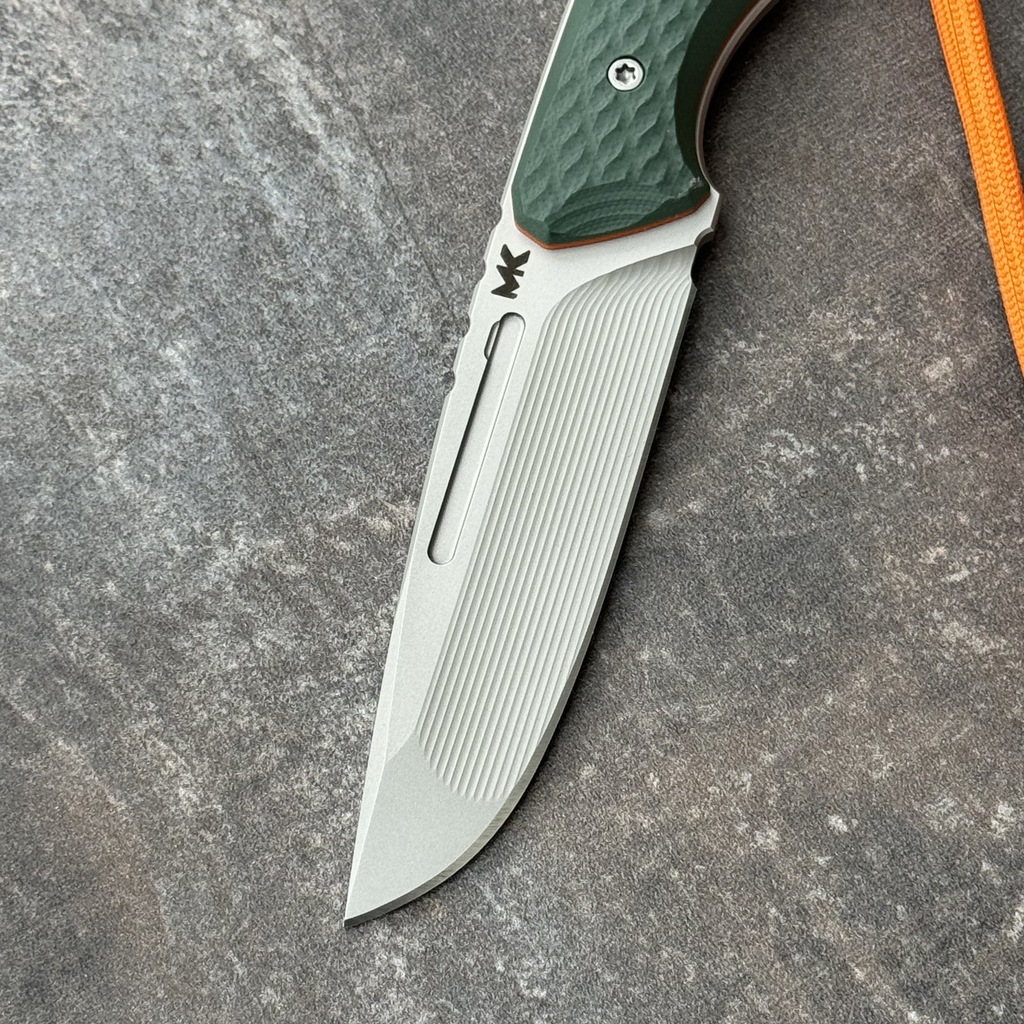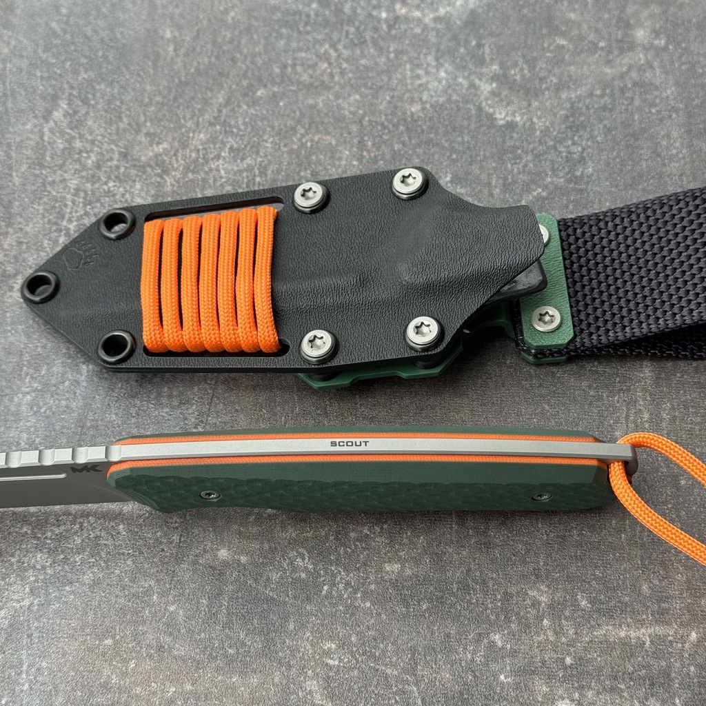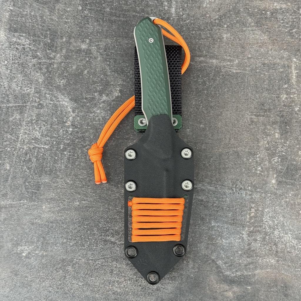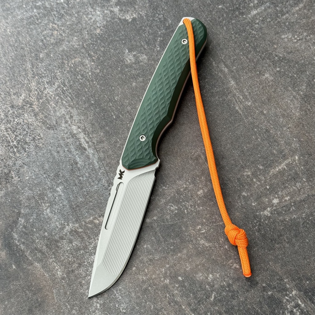 - Rękojeść: zielona z pomarańczowymi przekładkami (green G10 with orange liners)