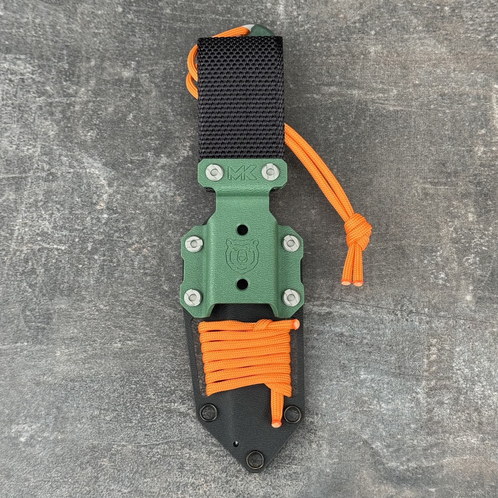 Nóż MK Knives & Tools Scout „Fear The Bear” Glass Blasted Elmax Green G10 with Orange Liners Black Kydex