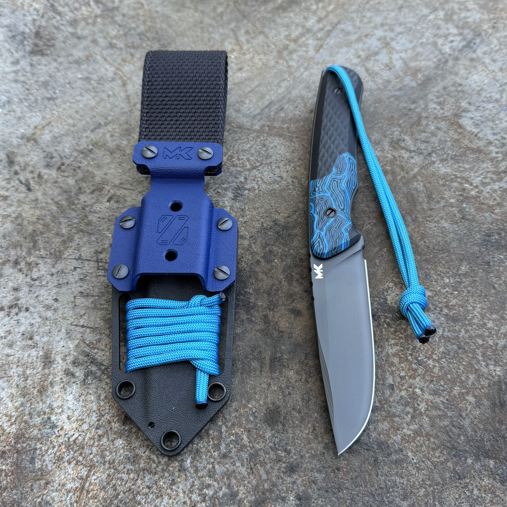Nóż MK Knives & Tools Scout “FuturePunk” posiada ostrze ze stali o świetnej wytrzymałości Vandis 4 Extra w czarnej powłoce DLC. Ostrze noża o profilu drop point wyprowadzone zostało szlifem rowkowym (wklęsły) dla uzyskania lepszych właściwości tnących. Okładziny rękojeści wykonano z czarnego kompozytu G10 z wstawkami o wyglądzie skorupy żółwia w niebiesko-czarnej kolorystyce. W zestawie znajduje się czarna kabura z Kydexu z niebieskimi dodatkami.