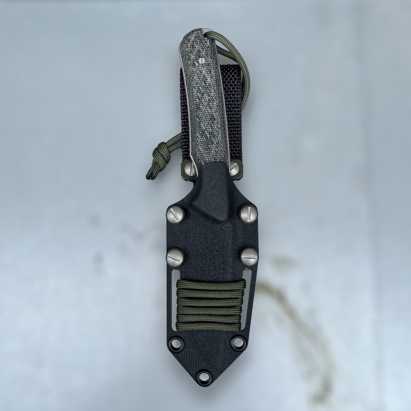 - Rękojeść: czarna micarta (Black Canvas Micarta) + oliwkowy kompozyt G10