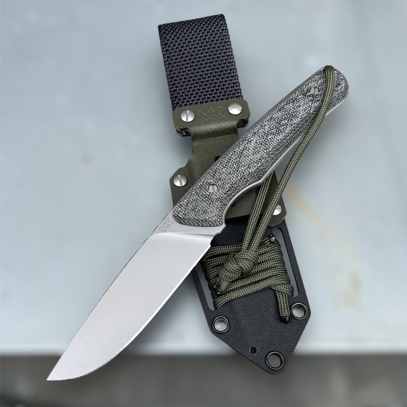 Nóż MK Knives & Tools Scout „Natty” posiada ostrze ze świetnej jakości stali z półki premium: Elmax. Okładziny rękojeści powstały z czarnej micarty z oliwkowymi przekładkami z kompozytu G10. W zestawie znajduje się kabura z czarnego tworzywa Kydex, wzbogacona o dobrane kolorystycznie dodatki. Kabura posiada możliwość montażu do rozwiązań typu MOLLE, za sprawą znajdującej się w zestawie dodatkowej, specjalnie do tego zaprojektowanej czarnej klamry z Kydexu.