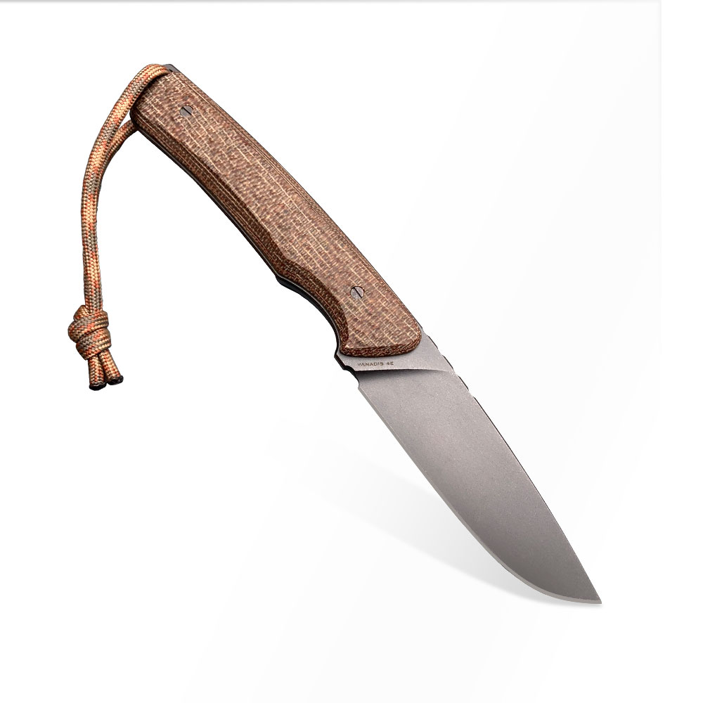 Okładziny rękojeści o ergonomicznym, zowalizowanym kształcie wykonane zostały z micarty. Micarta jest odporna na wilgoć, zmiany temperatury, większość rozpuszczalników i kwasów, posiada wysoką odporność na uszkodzenia mechaniczne. W prezentowanym nożu materiał okładek posiada chropowaty wzór zapobiegający ślizganiu się rękojeści w dłoni. Okładki rękojeści zostały skręcone stalowymi śrubami w powłoce PVD. Śruby dopełniają design noża, elegancko komponując się z czarnym ostrzem.