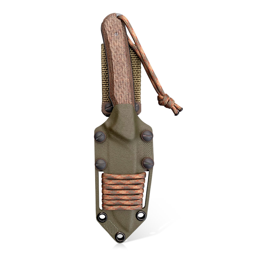 RĘKOJEŚĆ: Brązowa micarta + oliwkowe G10DŁUGOŚĆ CAŁKOWITA: 203 mm | 7.99″