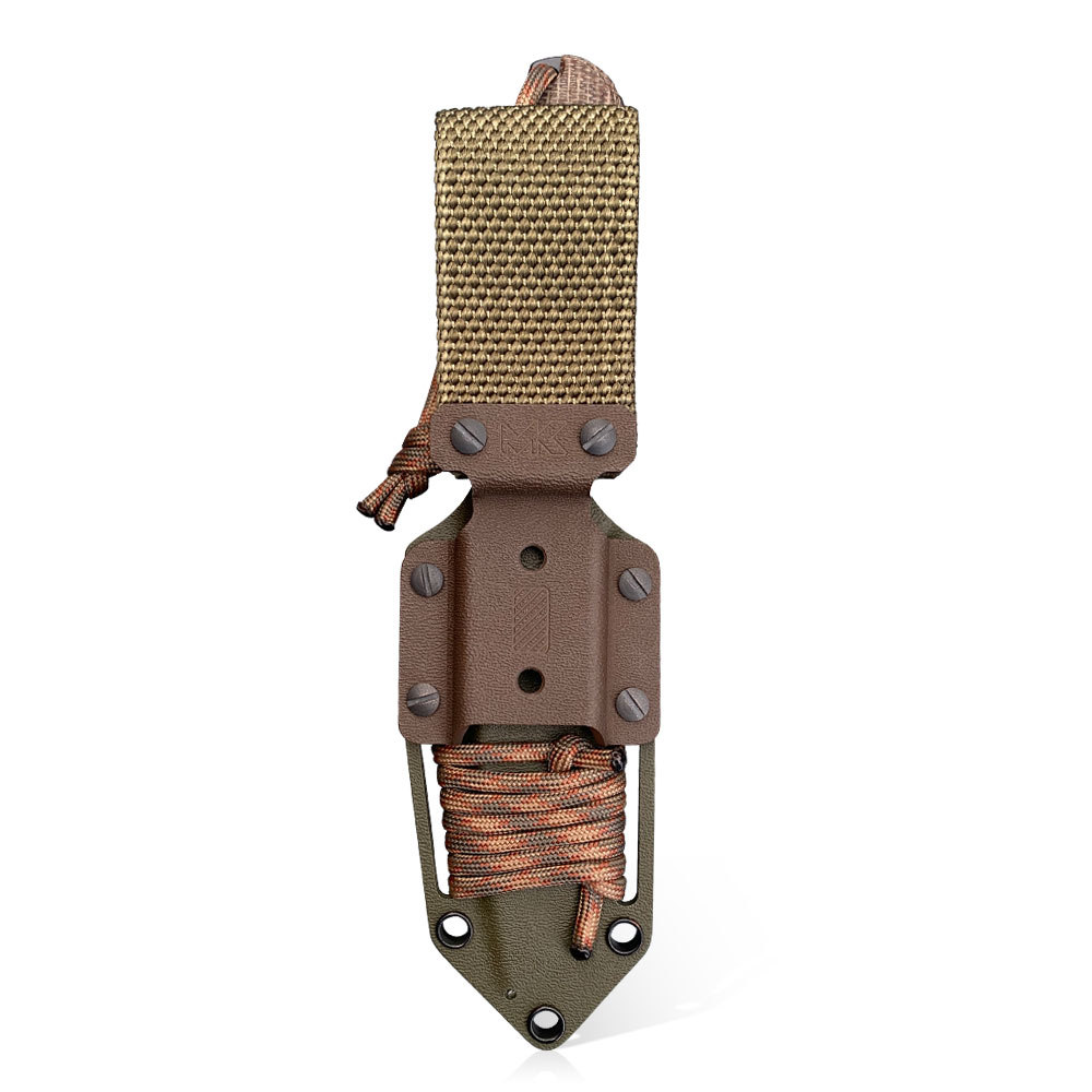 Kaburę możemy mocować na kilka sposobów. Do pasa mocujemy ją za pomocą zrobionej z wytrzymałego nylonu o dużej gramaturze parcianej przelotki, lub opcjonalnej klamry Kydex (klamra dodawana jest do zestawu). Do plecaków i innych elementów posiadających rozwiązania typu MOLLE, mocujemy ją za pomocą opcjonalnej klamry Kydex lub sznurkiem używając do tego otwory przelotowe znajdujące się w kaburze. Można do tego oczywiście użyć zapasu paracordu, którym opleciona jest kabura (jego barwa odpowiada odcinkowi znajdującemu się przy nożu).NAZWA: Scout „Neoteric”
