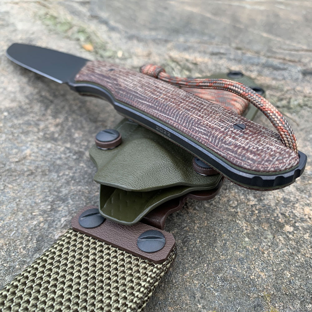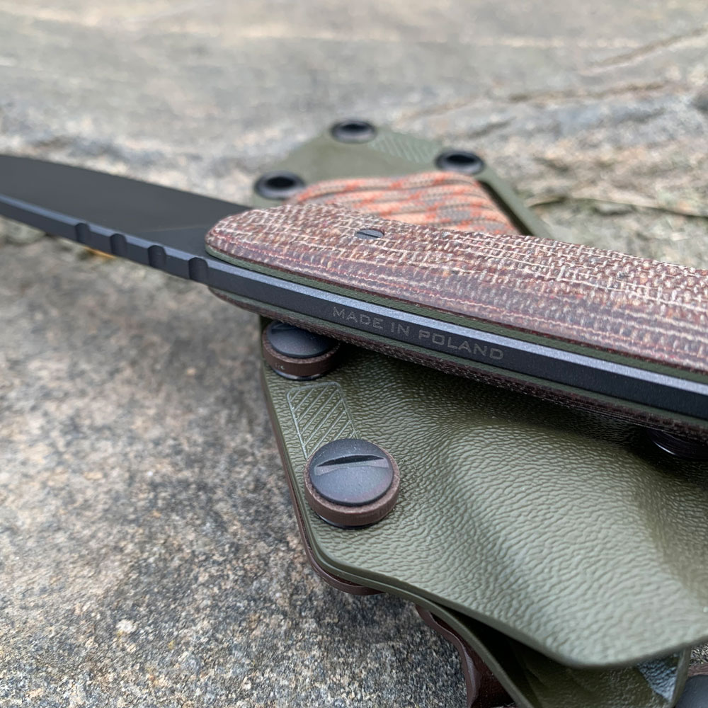 Nóż posiada kaburę z ręcznie formowanego tworzywa kydex cechującego się wysoką odpornością na uderzenia, zarysowania, charakteryzującego się niską chłonnością wilgoci, odpornego na różnorodne warunki atmosferyczne oraz wiele środków chemicznych.