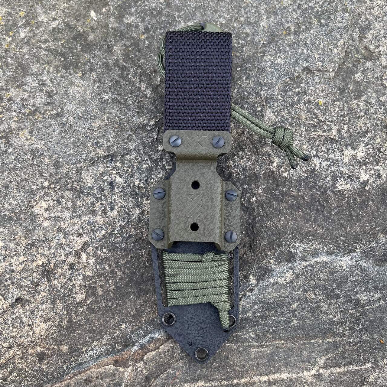 Kaburę do pasa mocujemyza pomocą tekstylnej przelotki. Kabura zaopatrzona została w otwory przelotowe, które można wykorzystać opcjonalnie do przytwierdzenia zestawu do plecaka czy elementu uprzęży taktycznej linką, sznurkiem czy paracordem. Można do tego oczywiście użyć zapasu paracordu, którym opleciona jest kabura (jego barwa odpowiada odcinkowi znajdującemu się przy nożu).