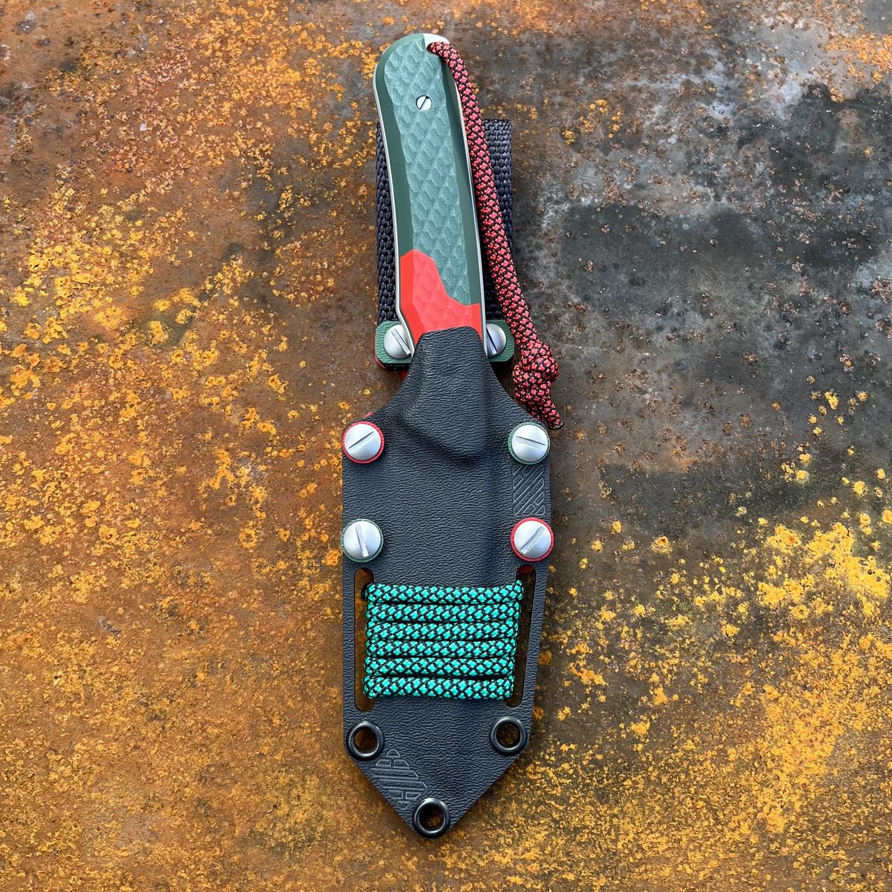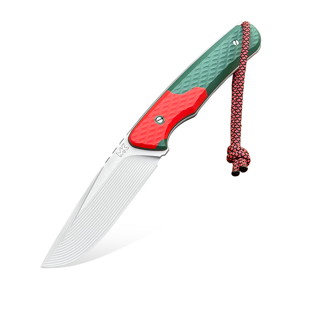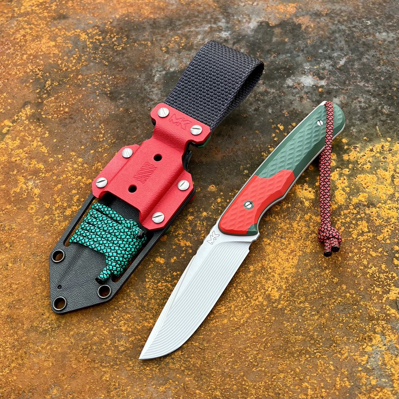 Nóż MK Knives & Tools Scout „R100R #2” posiada ostrze ze stali premium Vanax i wykończeniem bead blasted (szkiełkowanie). Nóż posiada okładziny rękojeści z kompozytu G10 w kolorach zielonym i czerwonym. W zestawie znajduje się kabura z tworzywa kydex, wzbogacona o kolorystyczne dodatki. Kabura posiada możliwość montażu do rozwiązań typu MOLLE, za sprawą znajdującej się w zestawie dodatkowej, specjalnie do tego zaprojektowanej klamry z kydexu.
