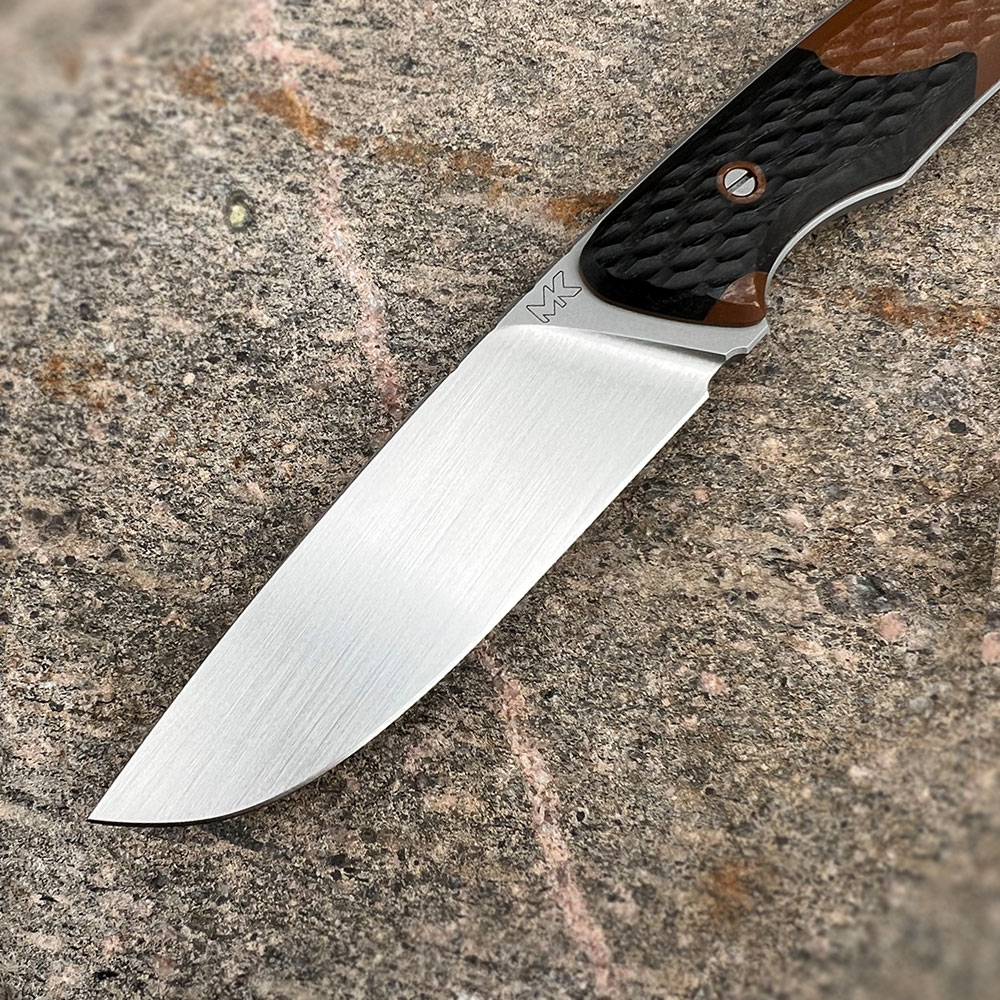 • Rękojeść: brązowy kompozyt G10 + drewno stabilizowane (dąb bagienny)