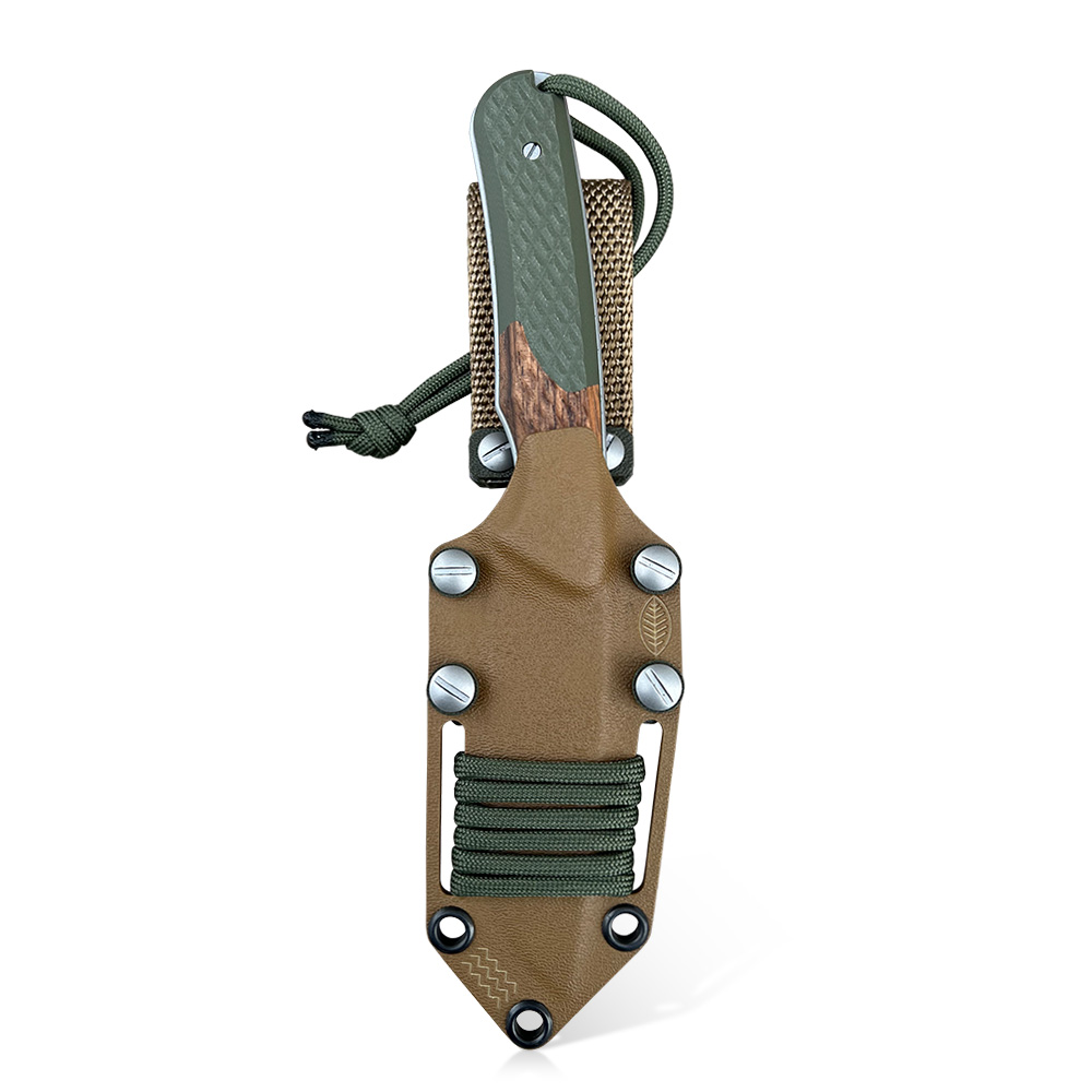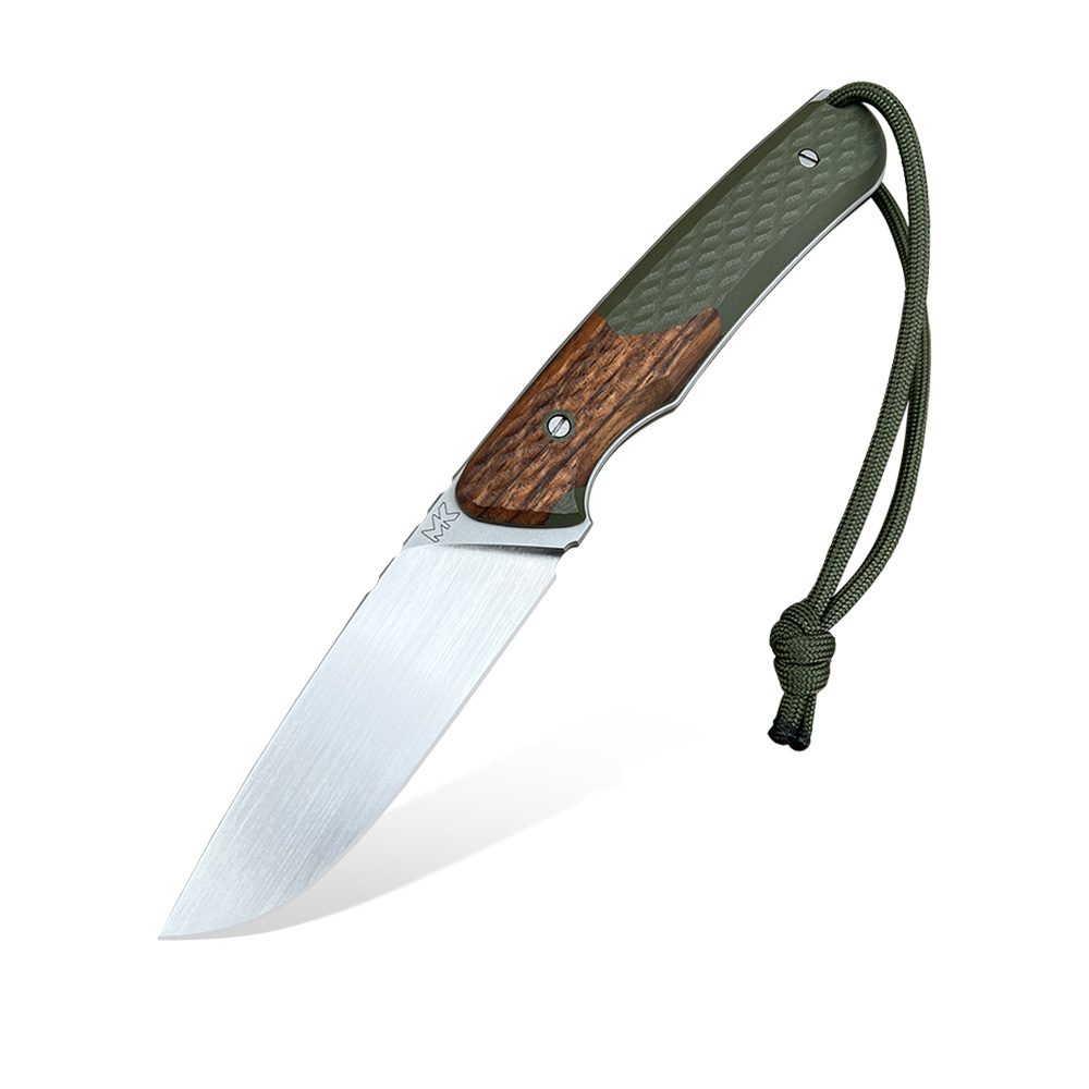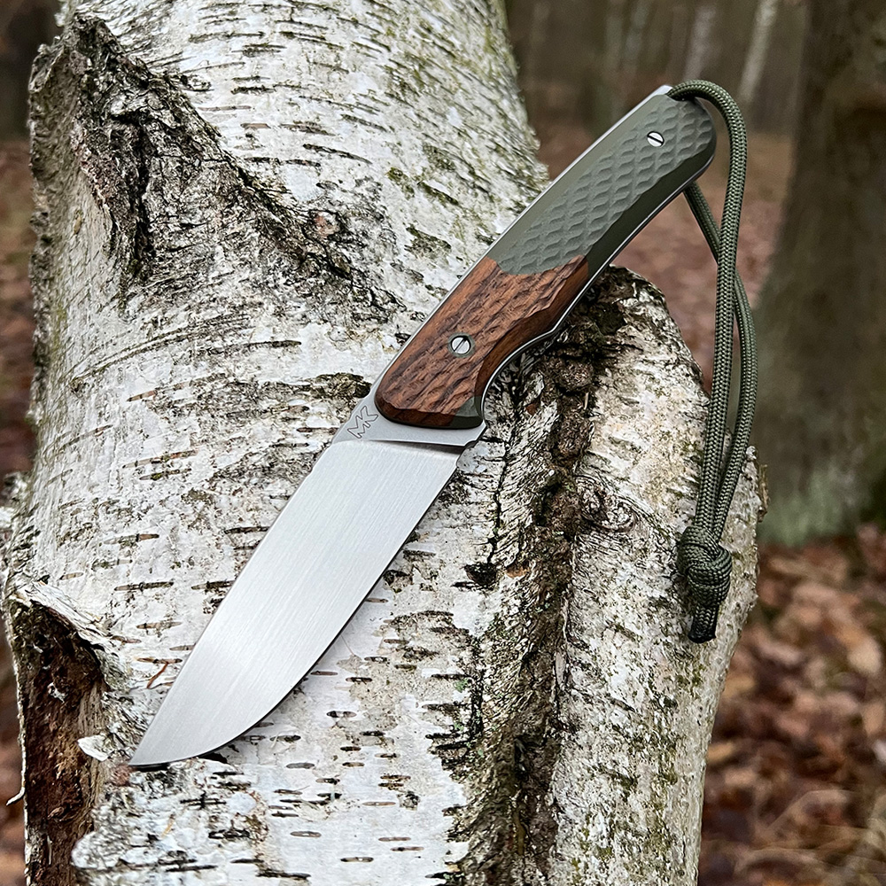 - Rękojeść: zielony kompozyt G10 + drewno stabilizowane (orzech włoski)